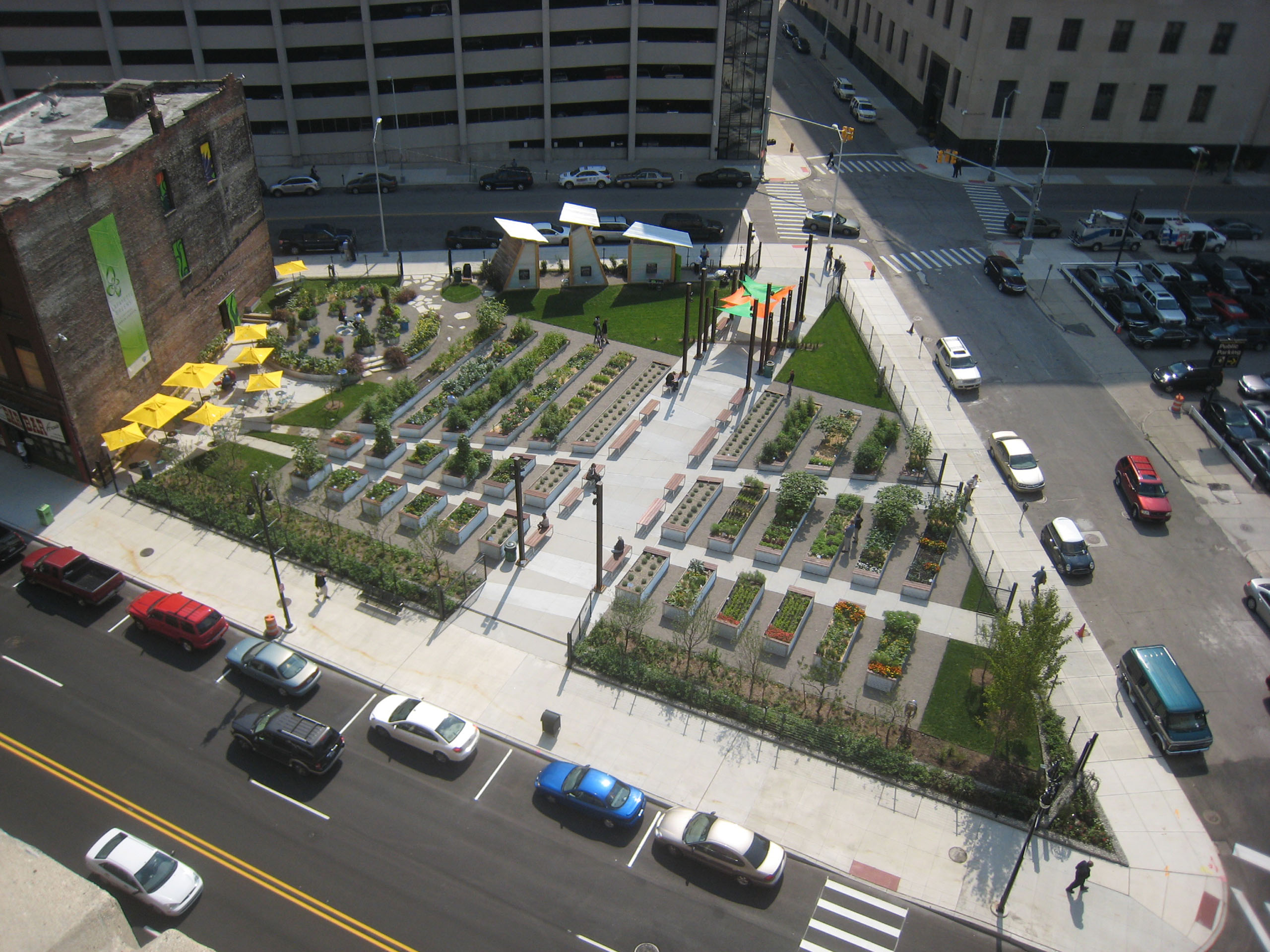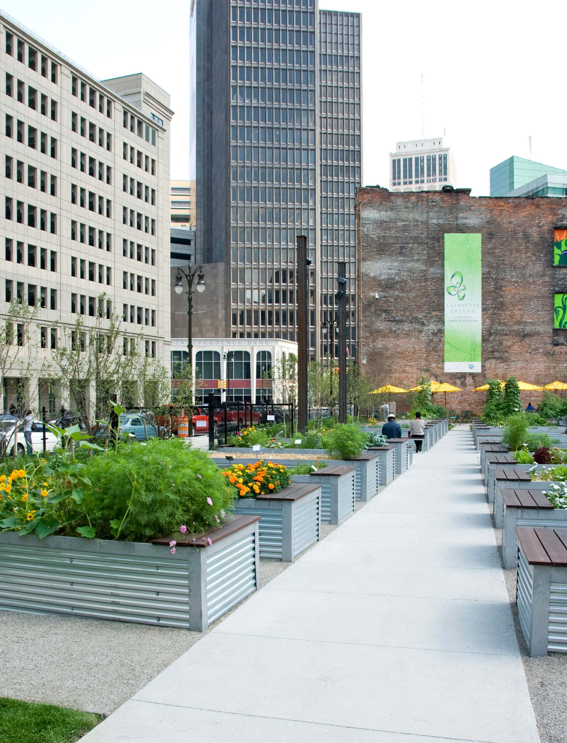 Міський сад-город із піднятими клумбами, спроєктований студією Kenneth Weikal Landscape Architecture, розташований на місці, де з 1923 до 2010 р. височів один із детройтських лендмарків Lafayette Building. Ця історична будівля стала жертвою кризи і, незважаючи на масові протести мешканців і воістину героїчну боротьбу за її збереження, була знесена.