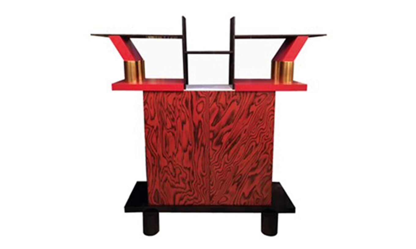 Создатель легенд — фирмы Olivetti и творческой группы «Мемфис» — и сам легенда, работавший над дизайном для Alessi, Knoll International, Poltronova. Этторе Соттсасс был приверженцем визуального радикализма — использовал яркие краски, антагонистические паттерны, конфликтующие формы. В этом стиле решен дизайн редкого экспоната — витрины, созданной Соттсассом в 1985 г. и представленной миланской галереей Roberta e Basta.