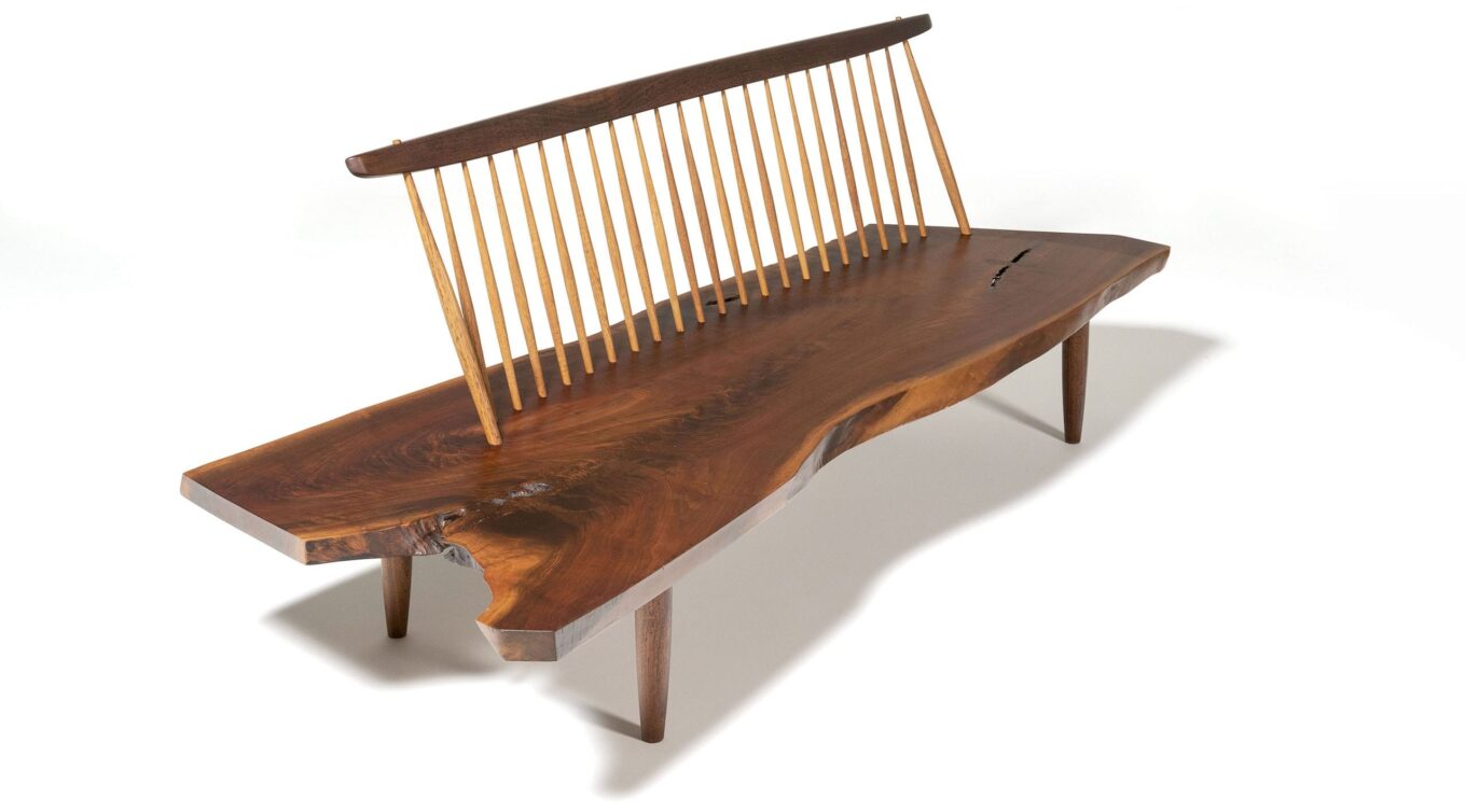 Японец по происхождению Джордж Накасима родился в США, учился в Американской школе изящных искусств в Фонтенбло, работал в Японии в архитектурной студии чеха Антонина Раймонда, ученика Фрэнка Ллойда Райта, проектировал в Индии в ашраме Шри Ауробиндо, где позже остался в качестве ученика. Подобные хитросплетения культур, ментальностей, религий несомненно оказали на него влияние — его мебель провокационно проста, словно он взял из всех своих эмоциональных опытов самое главное и придал ему физическую форму. Никогда еще роденовская фраза «Я беру глыбу мрамора и отсекаю все лишнее» не была и уже не будет визуализирована так ясно, как в работах Накасимы. Он объединил в своих объектах американский практицизм и восточные навыки ремесленного производства мебели. Древесину он покупал по всему миру, и его мебель легко узнать по фирменным скобам-бабочкам, которые соединяют швы. Предметы его дизайна по сей день выпускают мастерские Накасимы в Нью-Хоупе и Кагаве. Галерея Gokelaere & Robinson представит аутентичную скамью Conoid Bench, спроектированную и созданную Джорджем Накасимой в 1974 г.