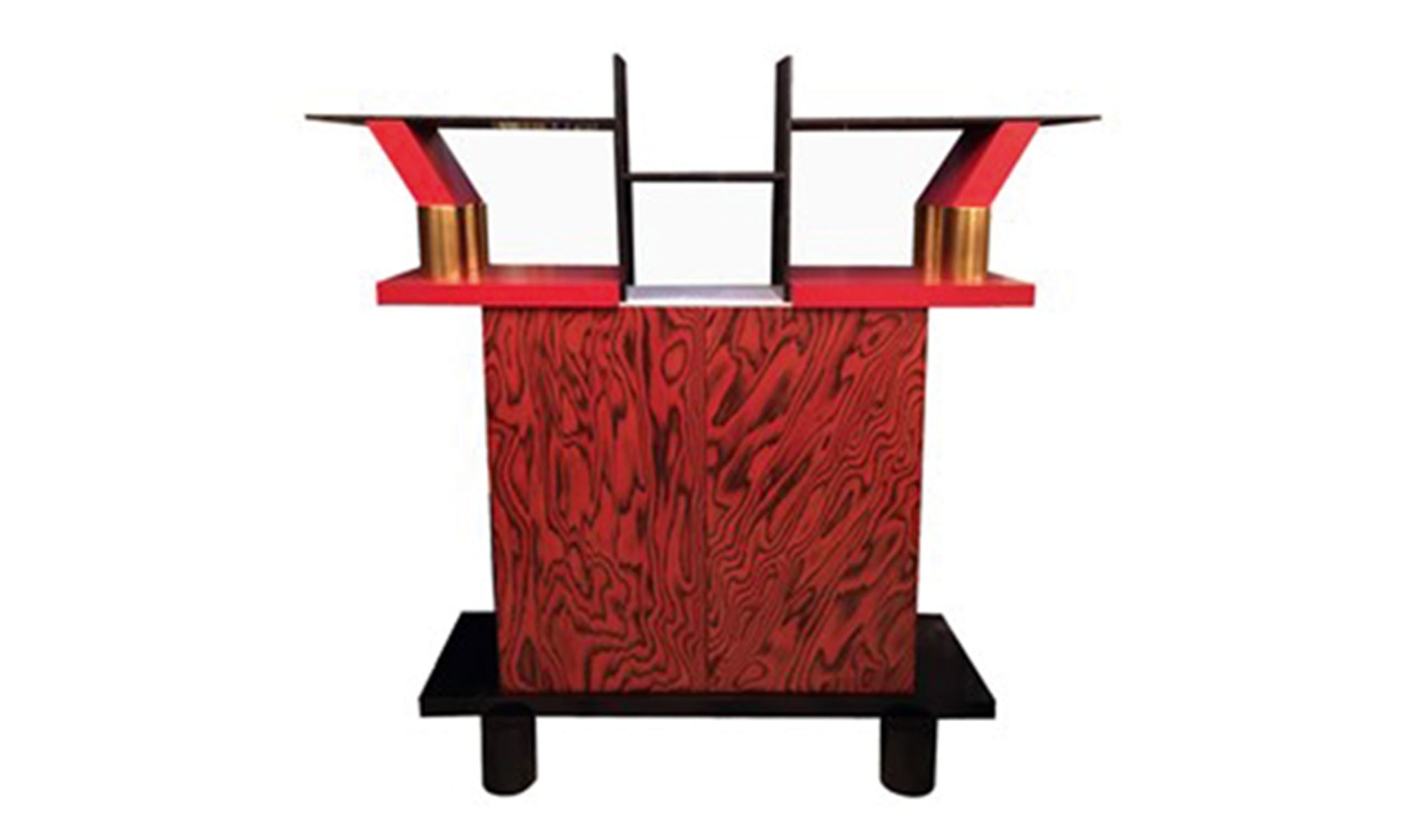 Создатель легенд — фирмы Olivetti и творческой группы «Мемфис» — и сам легенда, работавший над дизайном для Alessi, Knoll International, Poltronova. Этторе Соттсасс был приверженцем визуального радикализма — использовал яркие краски, антагонистические паттерны, конфликтующие формы. В этом стиле решен дизайн редкого экспоната — витрины, созданной Соттсассом в 1985 г. и представленной миланской галереей Roberta e Basta.