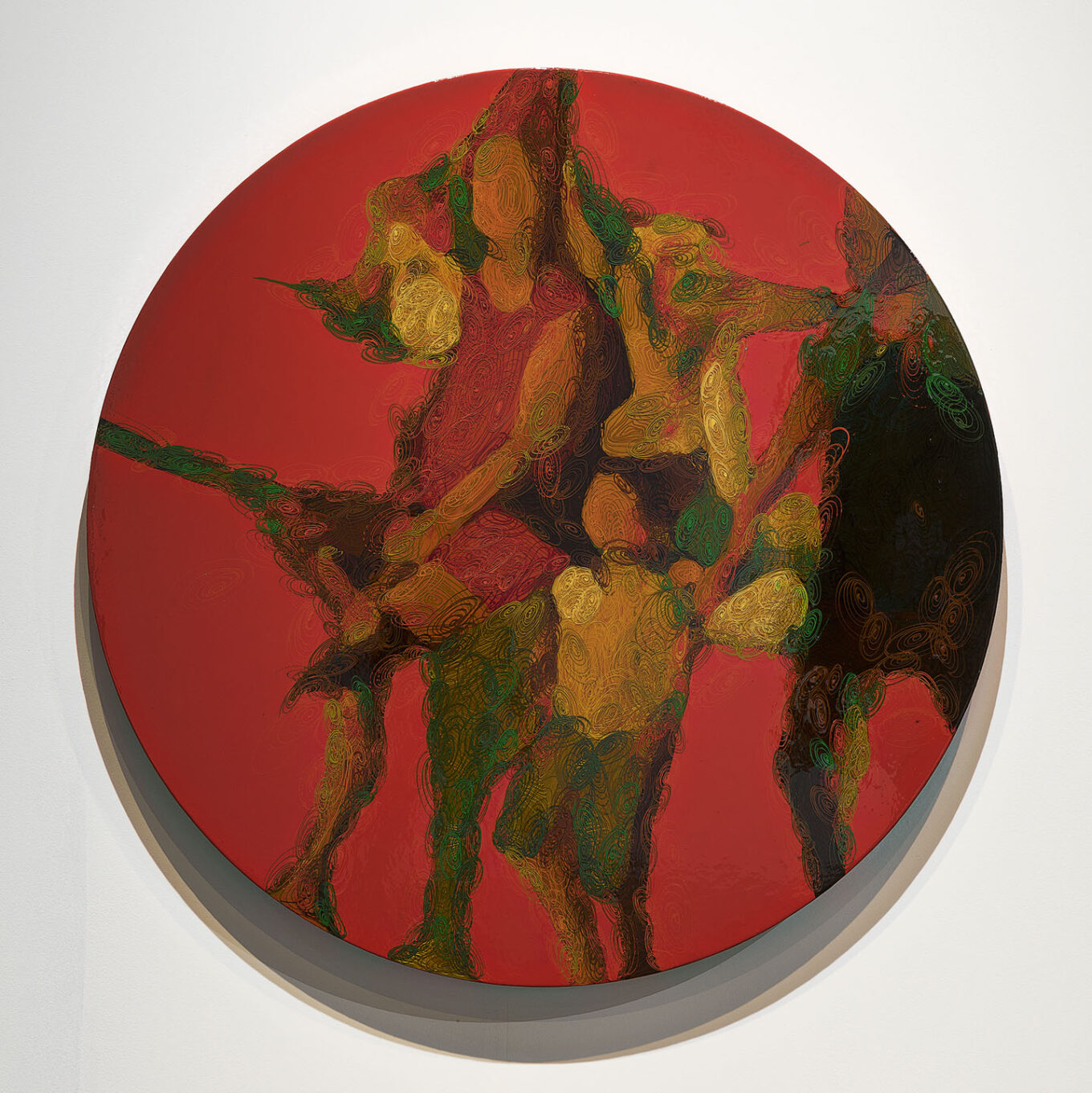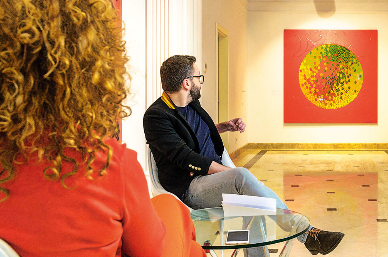 Оксана Мась, Костянтин Ковшевацький (Pragmatika) у галереї Art Ukraine. На задньому плані — робота із серії Mandala Dance, 2015 р.