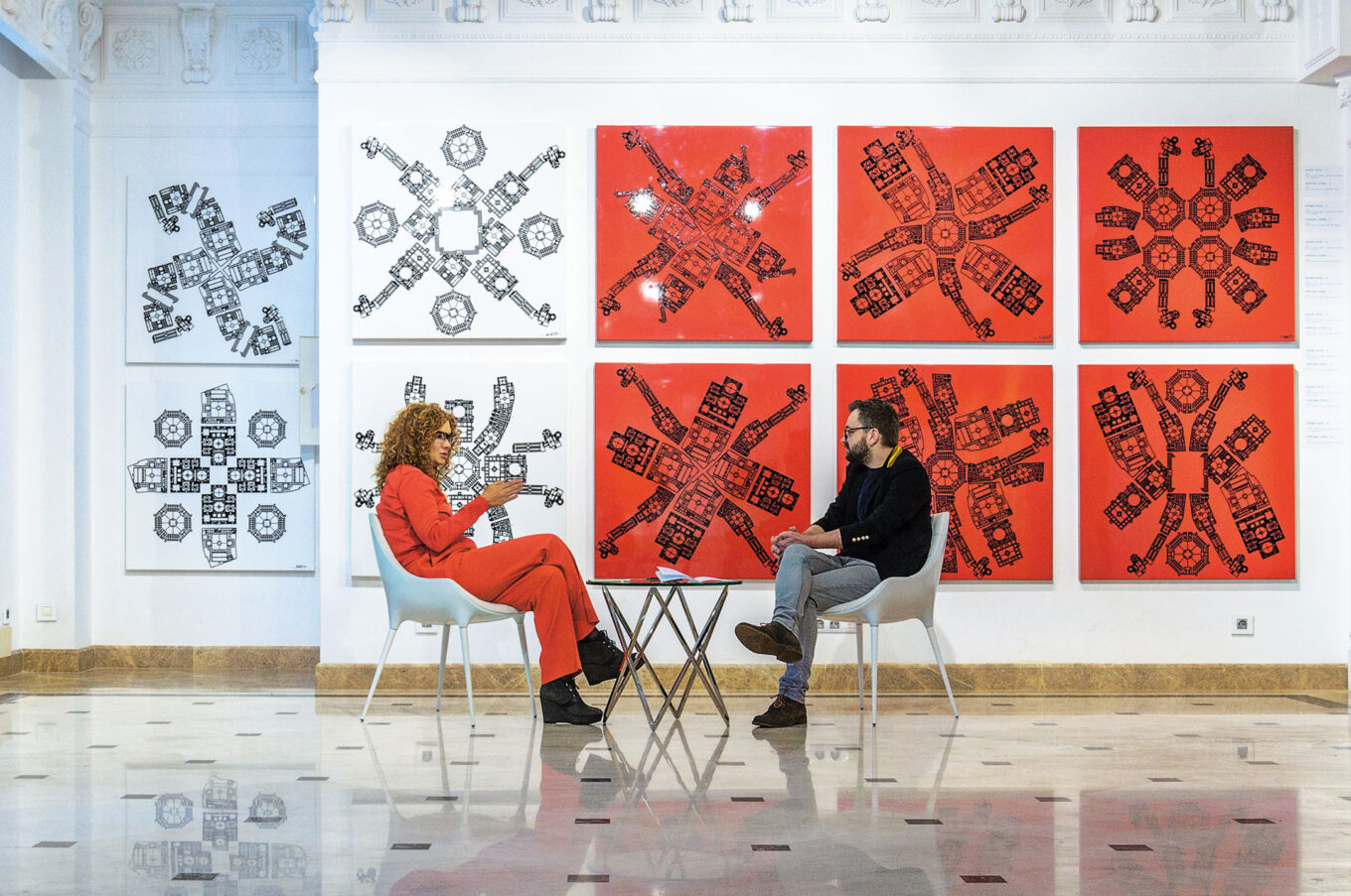 O. M.: Я із самого початку знала, що ці плани мають бути виконані якимось гарним візерунком. У Мілані, наприклад, на виставці «Духовне місто» було з неймовірними вулицями, що переходять в орнаменти з квітів. Спочатку я хотіла, знаєш, «загострити тему»: синагогу поставити з мечеттю… А потім свідомість абстрагувалася. І я просто почала складати квіти.