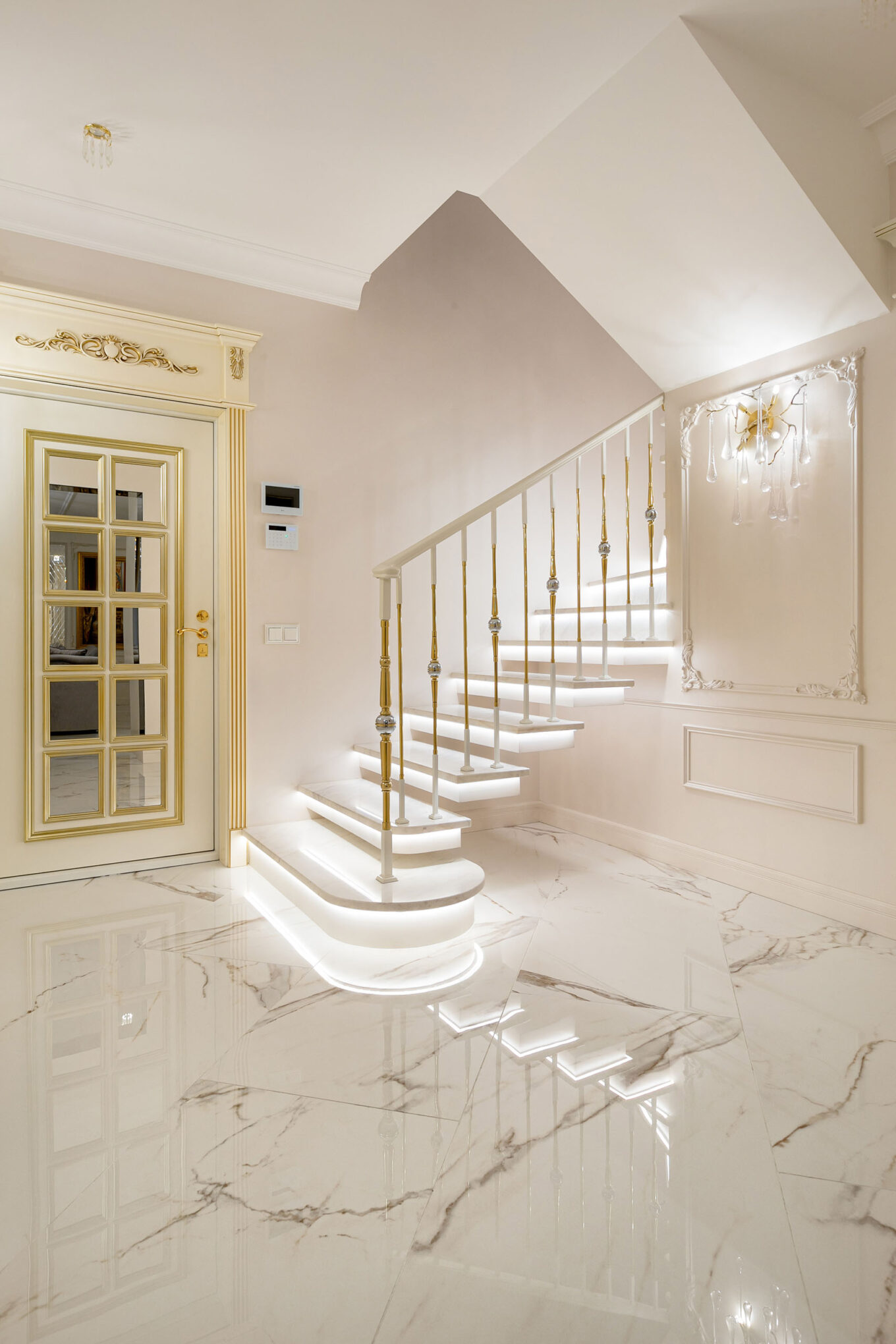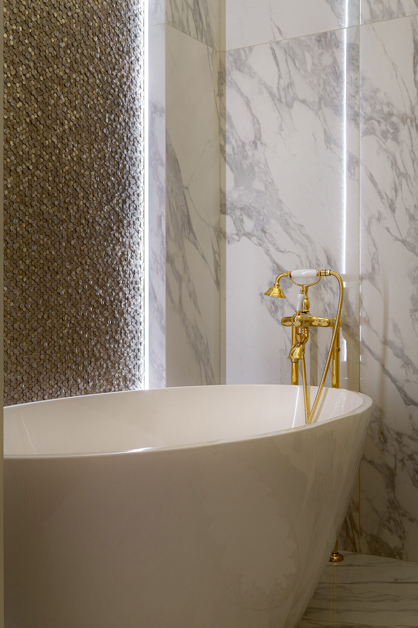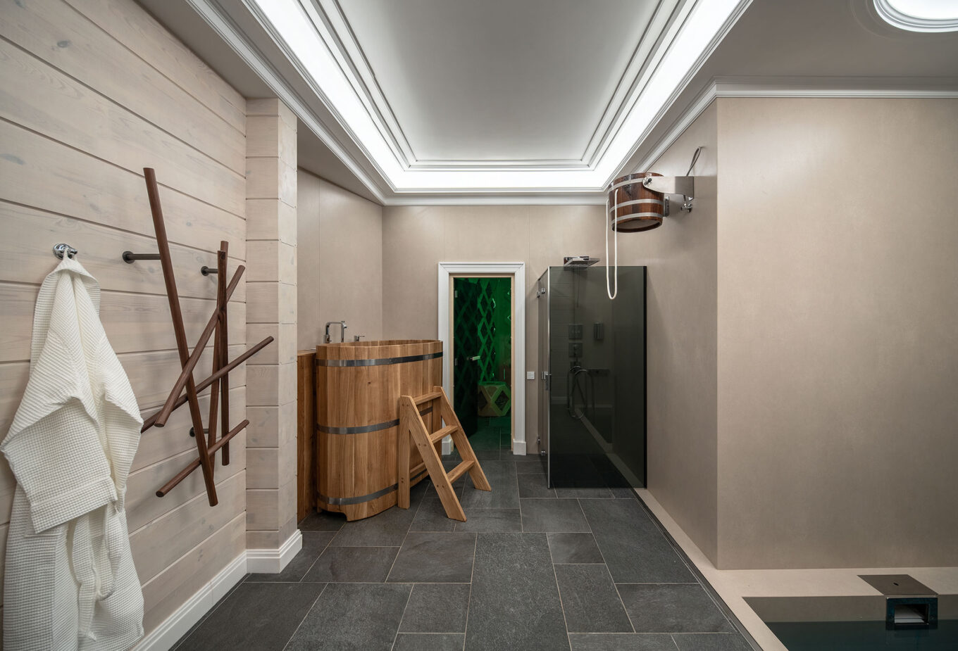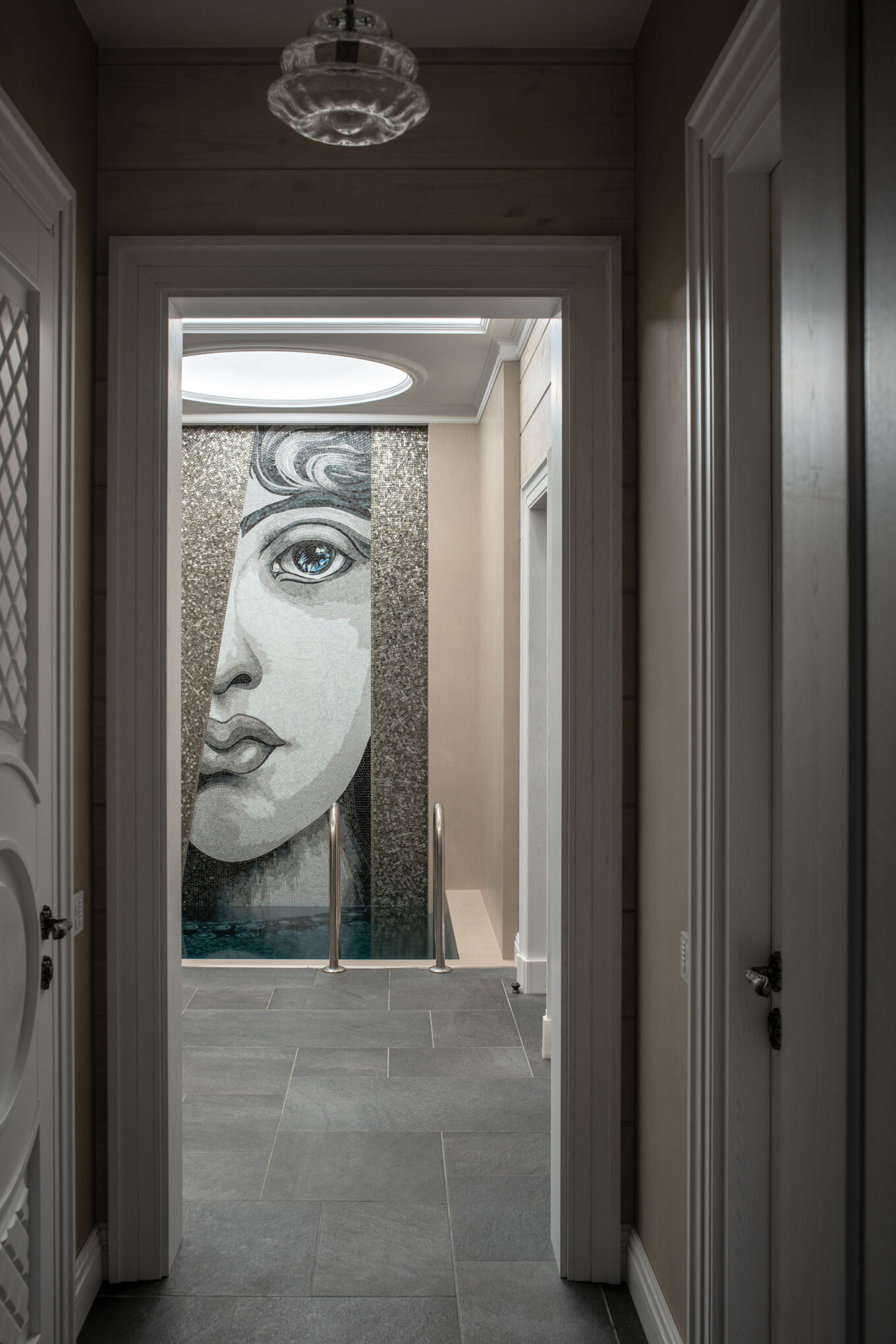 Изюминкой комплекса стало панно SICIS — мозаика, которая входит прямо в воду бассейна. Выразительный монохромный штрих — портрет девушки с одним цветовым акцентом, ярко-голубым глазом.