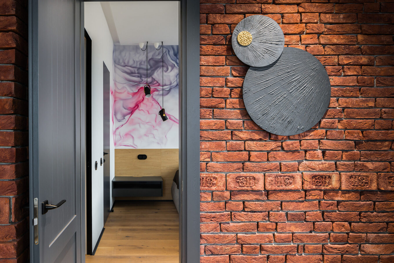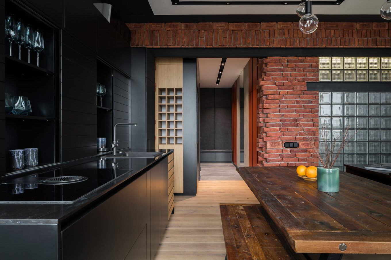 Мы делали квартиру для молодой креативной девушки. Ее пожеланием было избавиться от неудобной изначальной планировки. Нам удалось сделать просторную гостиную с кухней и столовой зоной, из пяти окон которой открывается живописный вид на Печерск. Мастер-зона включает в себя спальню, ванную и гардеробную, стена которой выполнена из стеклоблоков. АГРОМАТ помог нам в подборе материалов и комплектующих для санузлов и с паркетной доской для всей квартиры.