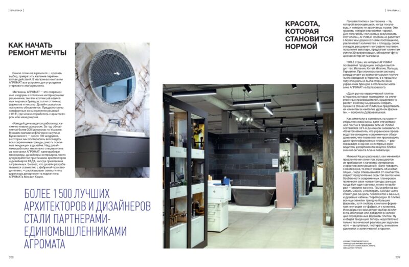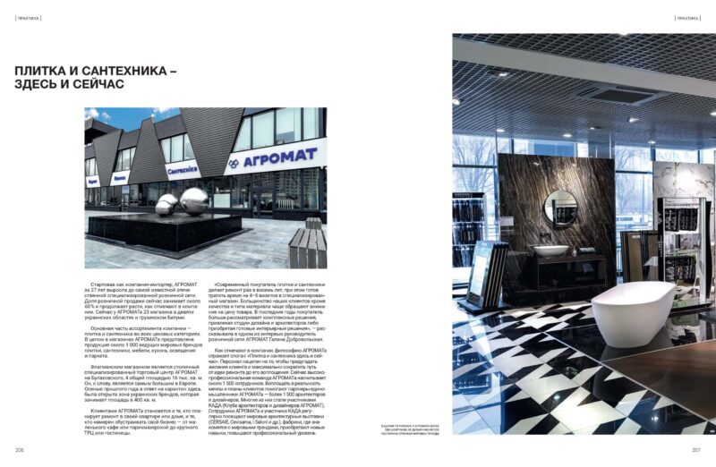 «Каждый день ведется работа над каким‑то новым шоурумом. За год обновляется более 200 шоурумов по Украине. В нашем магазине-флагмане на улице Булаховского — около 100 шоурумов, в которых мы постарались воссоздать все современные тренды, учесть основные тенденции в дизайне. Над дизайнами работают несколько специалистов из компании АГРОМАТ: категорийные менеджеры, дизайнеры интерьеров, часто для разработки приглашаем архитекторов и дизайнеров КАДА, иногда привлекаем заграничных. Бывает, что дизайн разрабатывается совместно с фабрикой-производителем», — рассказывает заместитель директора департамента маркетинга АГРОМАТа Михаил Кацко.