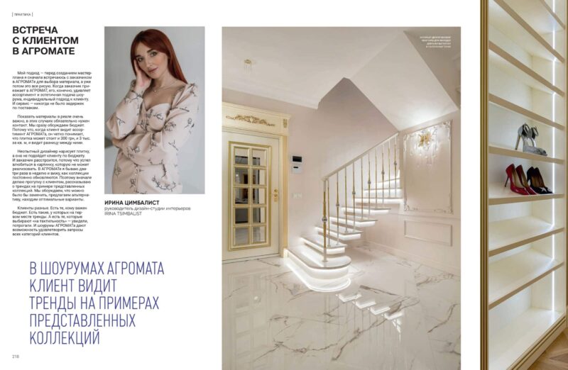 Неопытный дизайнер нарисует плитку, а она не подойдет клиенту по бюджету. И заказчик расстроится, потому что успел влюбиться в картинку, которую не может реализовать. В АГРОМАТе я бываю два-три раза в неделю и вижу, как коллекции постоянно обновляются. Поэтому вначале делаю прогулку с клиентом, рассказываю о трендах на примере представленных коллекций. Мы обсуждаем, что можно было бы заменить, предлагаем альтернативу, находим оптимальные варианты.