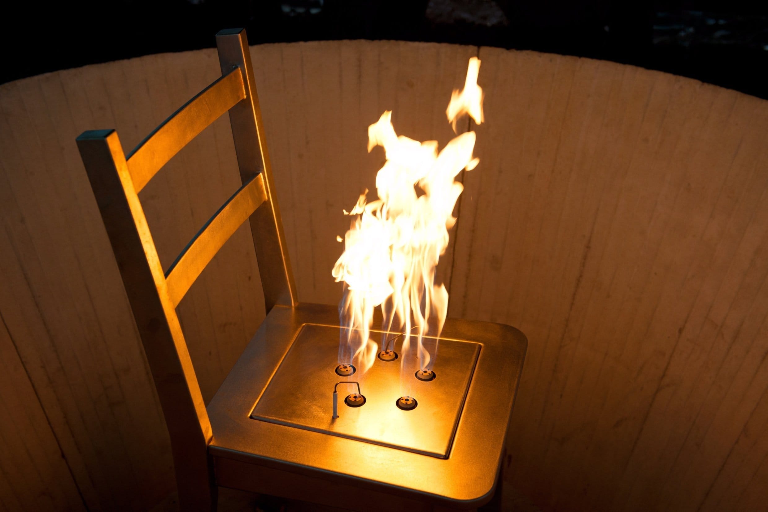 Окремо від кокона встановлений кубічний павільйон із чорного скла. У ньому знаходиться інсталяція «Вічне багаття відьом» — це стілець із палаючим сидінням і сім дзеркал навколо нього.