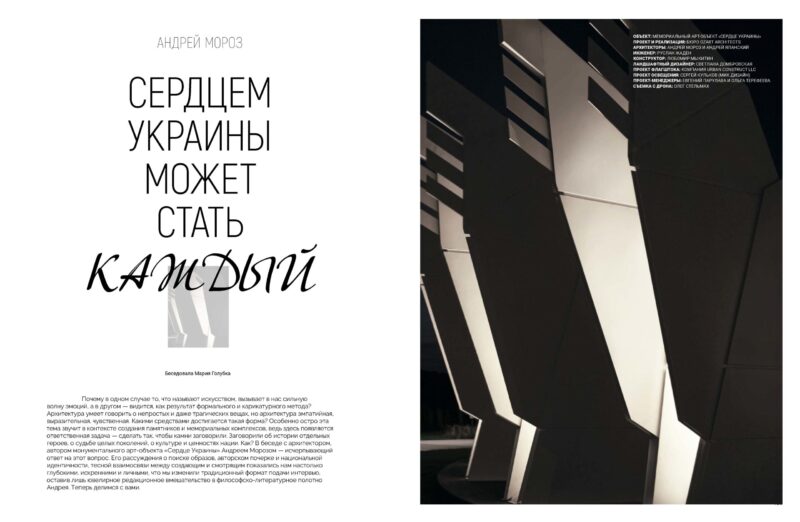 У розмові з архітектором, автором монументального артоб’єкта «Серце України» Андрієм Морозом — вичерпна відповідь на це запитання. Його міркування про пошук образів, авторський почерк і національну ідентичність, тісний взаємозв’язок між тим, хто створює, і тим, хто споглядає, здалися нам настільки глибокими, щирими та особистими, що ми змінили традиційний формат подачі інтерв’ю, залишивши тільки ювелірне редакційне втручання у філософсько-літературне полотно Андрія. Тепер ділимося з вами.