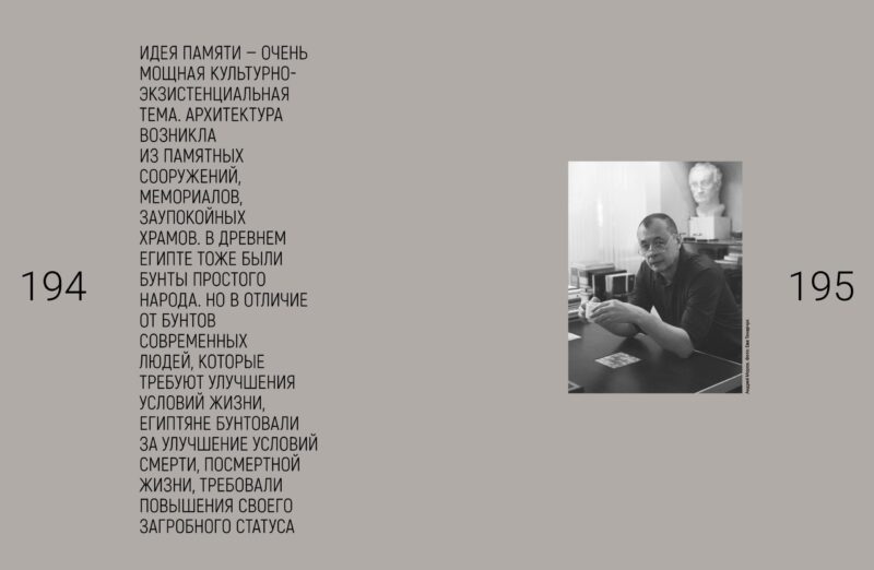 Ідея пам’яті — дуже потужна культурно-екзистенційна тема. Архітектура виникла з пам’ятних споруд, меморіалів, заупокійних храмів. У Стародавньому Єгипті теж були бунти простого народу. Але на відміну від бунтів сучасних людей, які вимагають покращення умов життя, єгиптяни бунтували за покращення умов смерті, посмертного життя, вимагали підвищення свого потойбічного статусу