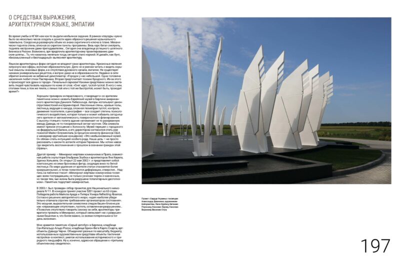 Мені подобається пам’ятник «Сірий автобус» у Берліні, цвинтар Сан-Катальдо Альдо Россі, кладовище Бріон-Вега Карло Скарпи, артоб’єкти Давида Черні. Об’єднує різні за масштабом, бюджетом, використаними мистецькими засобами об’єкти тактовне «вбудовування» в контекст, уміле використання історичного та природного ландшафтів. Ну і, звісно, адресне звернення до «третього об’єктивного свідка».