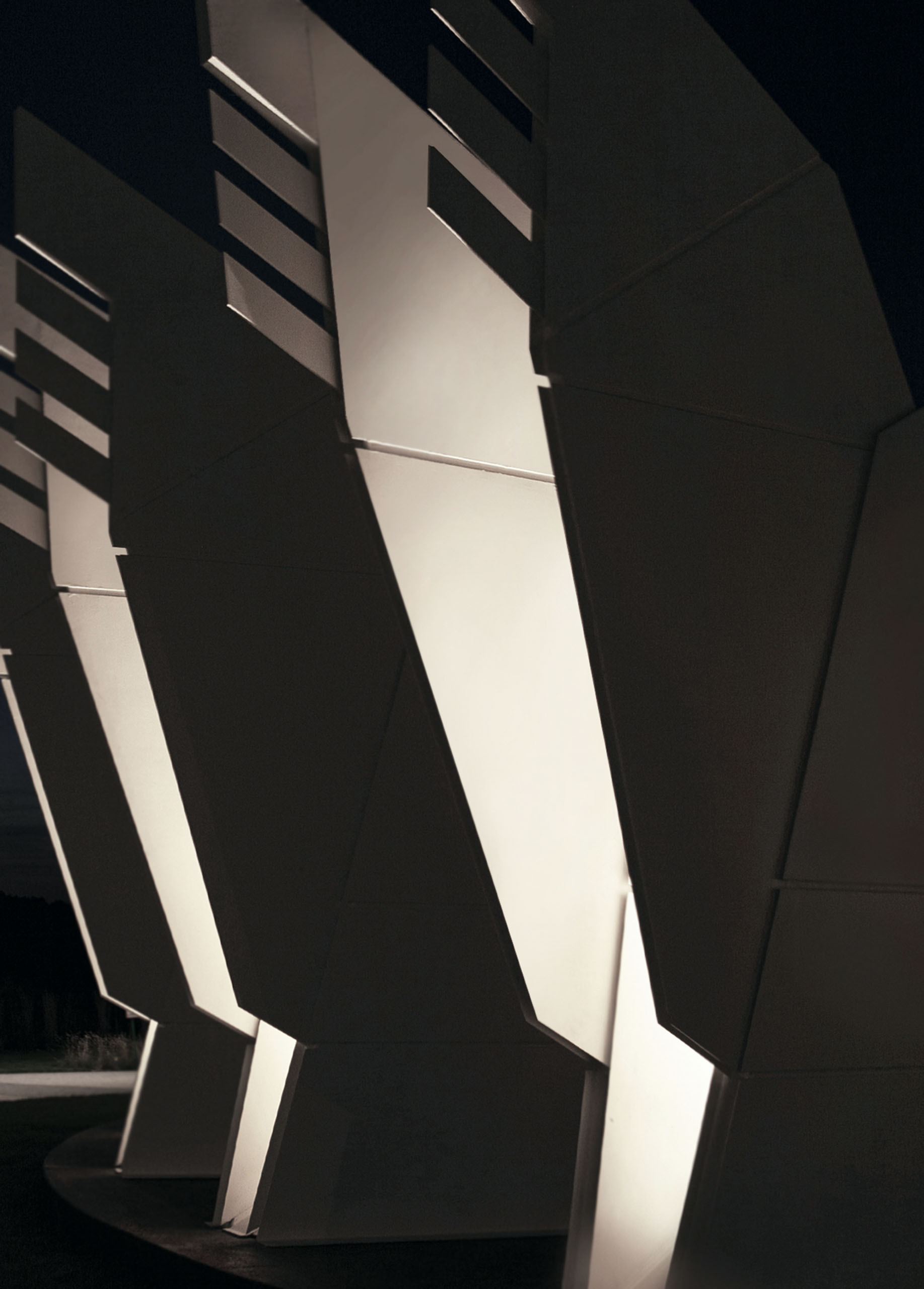 «Крила» — металеві каркасні конструкції висотою 4,8 м, пофарбовані в білий колір. Поверхні капітальних споруд комплексу оздоблені плитами з природного каменю (лабрадорит Невирівського родовища). Для більшої виразності використане терасування навколо композиційного центру. Поверхні пішохідних доріжок викладені ФЕМами сірих відтінків.