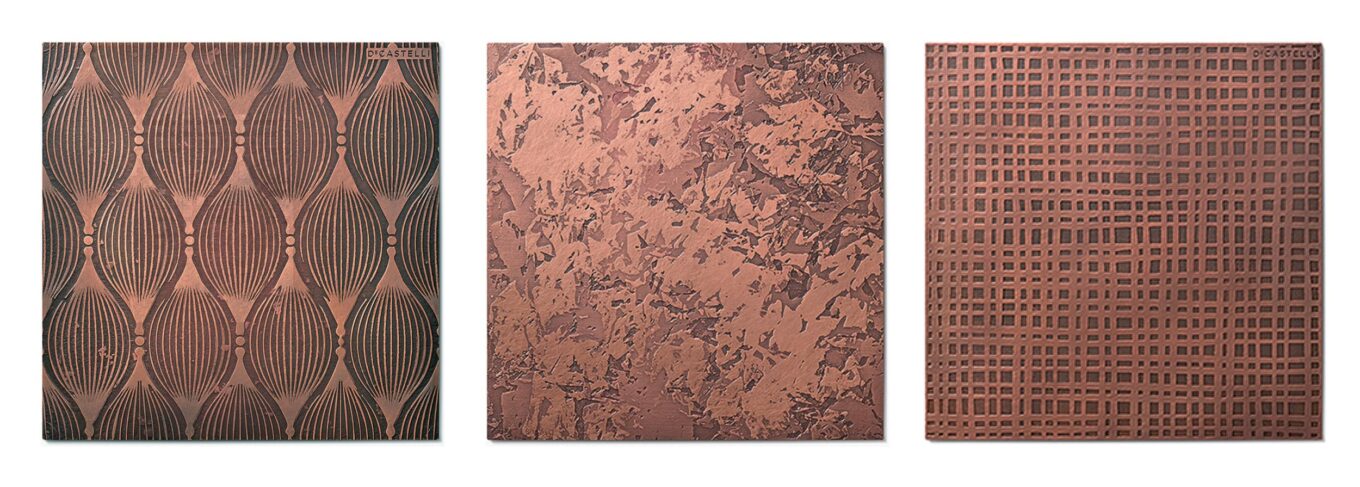 Разработанная фабрикой декоративная отделка Poyagi иллюстрирует удачное сочетание эмали и меди. Отдельного внимания заслуживает ноу-хау De Castelli, созданное в коллаборации с дизайнером Паолой Ленти. Речь о ткани, выполненной путем плетения и окисления металлической нити. Сотканная разными способами, она может варьироваться по фактуре — от воздушной до плотной. Один из экспериментов в этой технологии — плетение Bosco. Смонтированное на декоративную панель-буазери, полотно Bosco становится самостоятельным элементом декора в интерьере или может быть легко интегрировано в композицию из разного вида отделок.