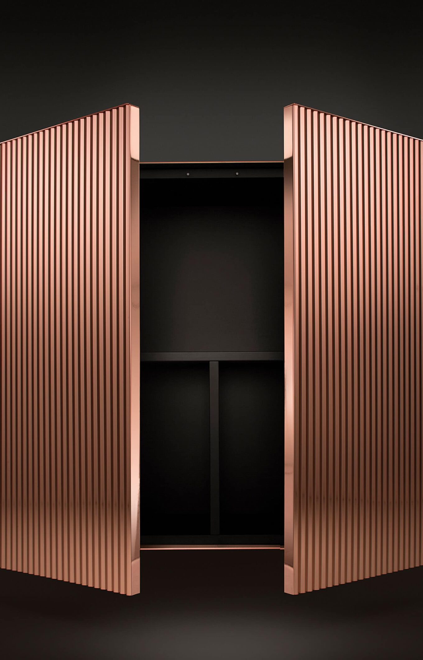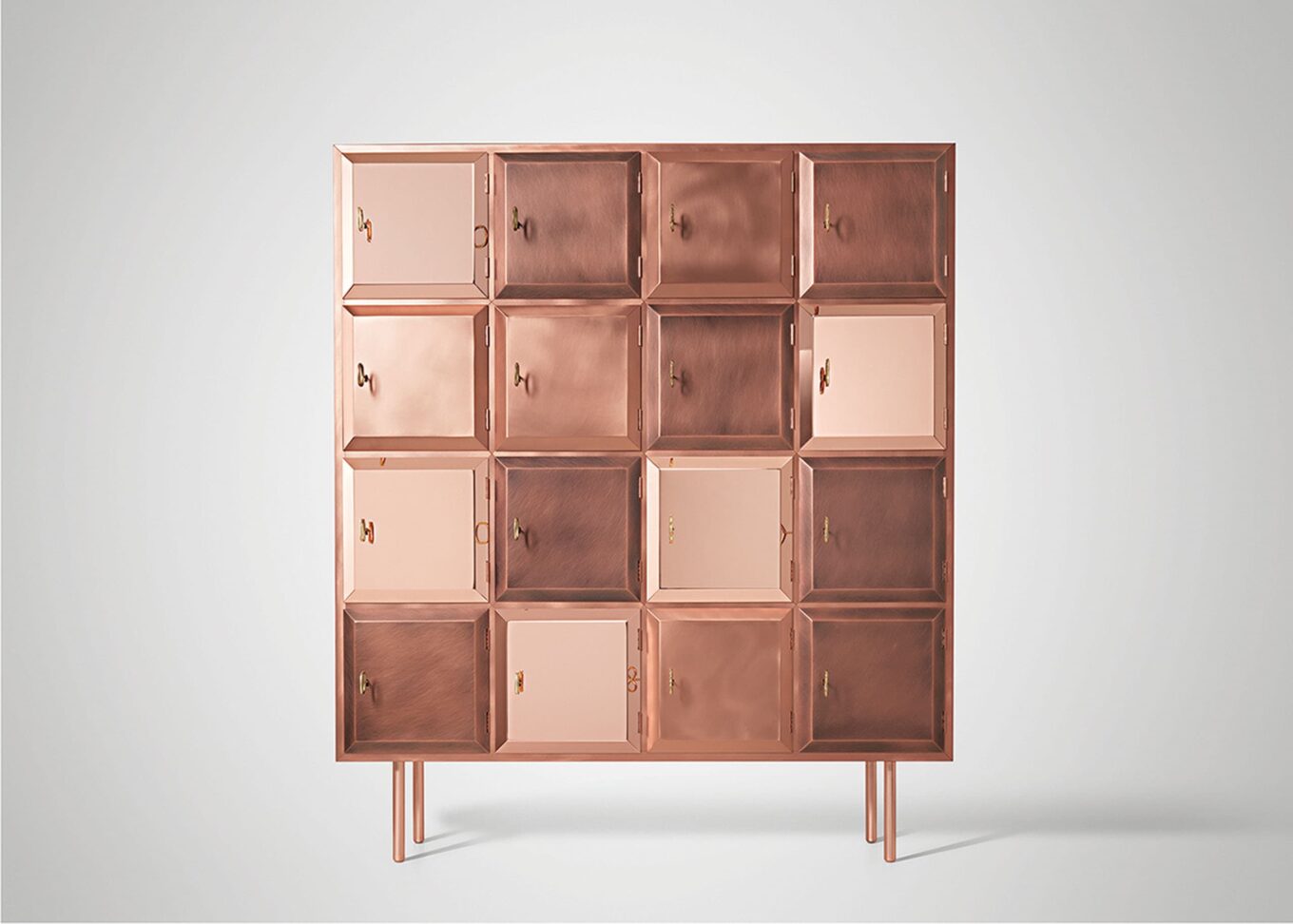 Дизайнер Ника Зупанк предлагает хранить секреты, запирая их в шкаф Longing Cabinet, состоящий из множества отделений, дверцы которого выполнены из меди, но отличаются по типу отделки. Отдельного внимания заслуживают изящные металлические ключи — деталь, без которого этот шкаф не выглядел бы таким сказочным. Elizabeth — небольшой комод с «гофрированным» фасадом, который создала бельгийский дизайнер Натали Деве. В этом объекте проиллюстрирована техника гибки металла, разработанная фабрикой De Castelli. Благодаря розовому оттенку металла и вышеупомянутой технике, несмотря на строгую геометрическую форму, объект наделен изящной пластикой. Стеллаж Voltе воплощает идеи французского дизайнера Констанс Гиссе. В ее проекте металл создает ощущение тепла и уюта.