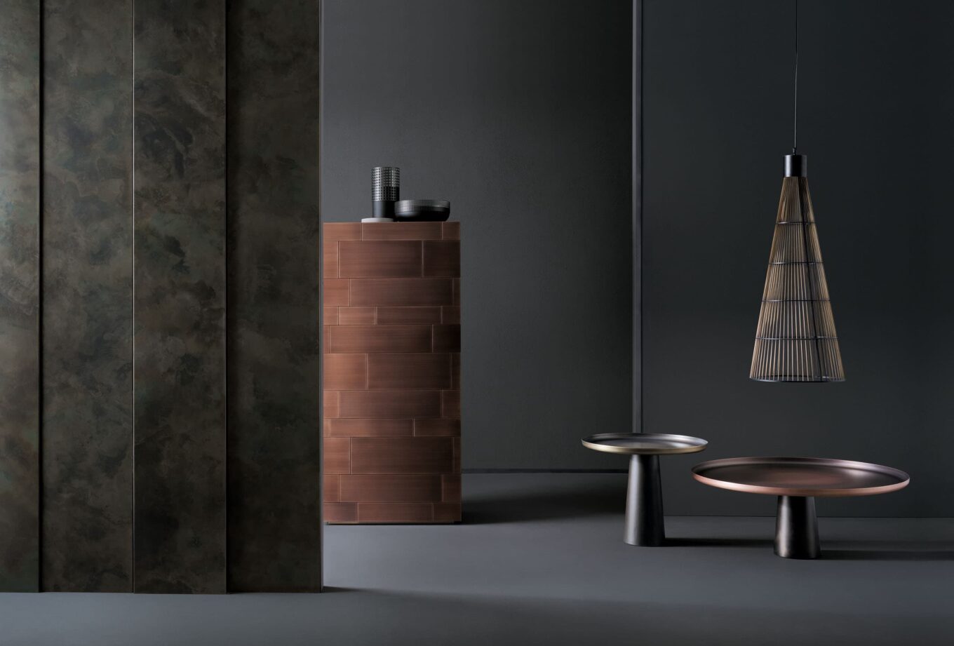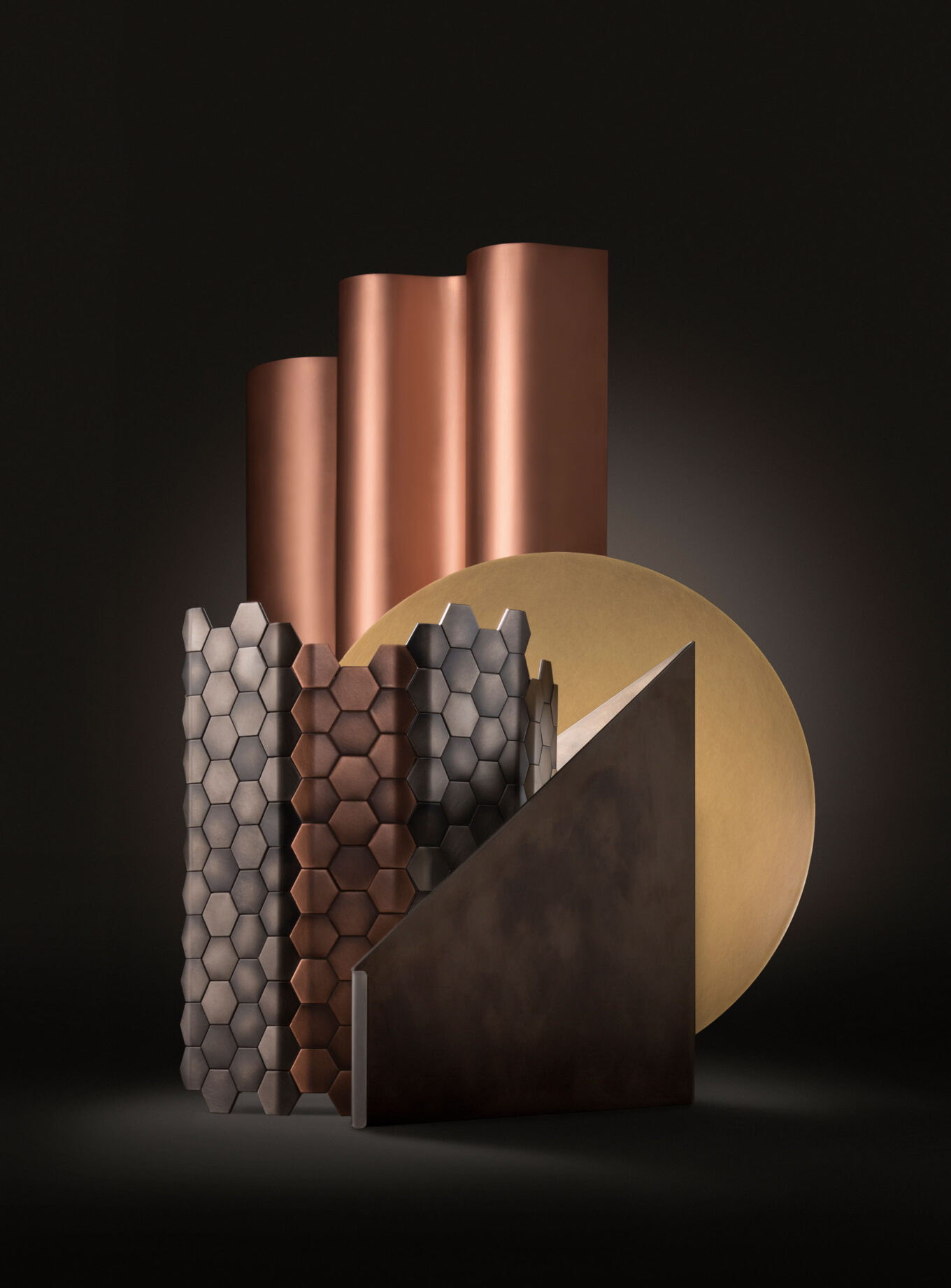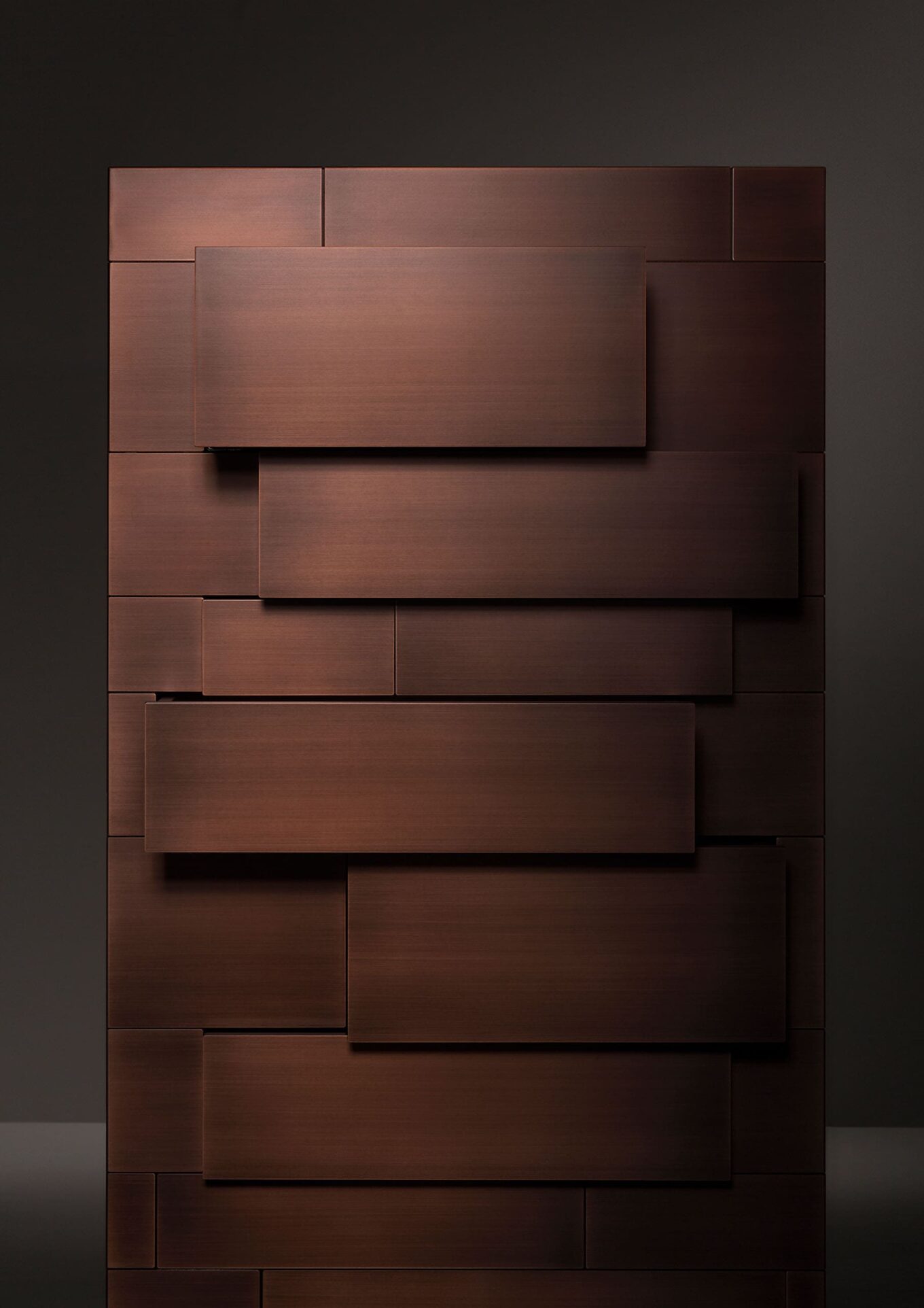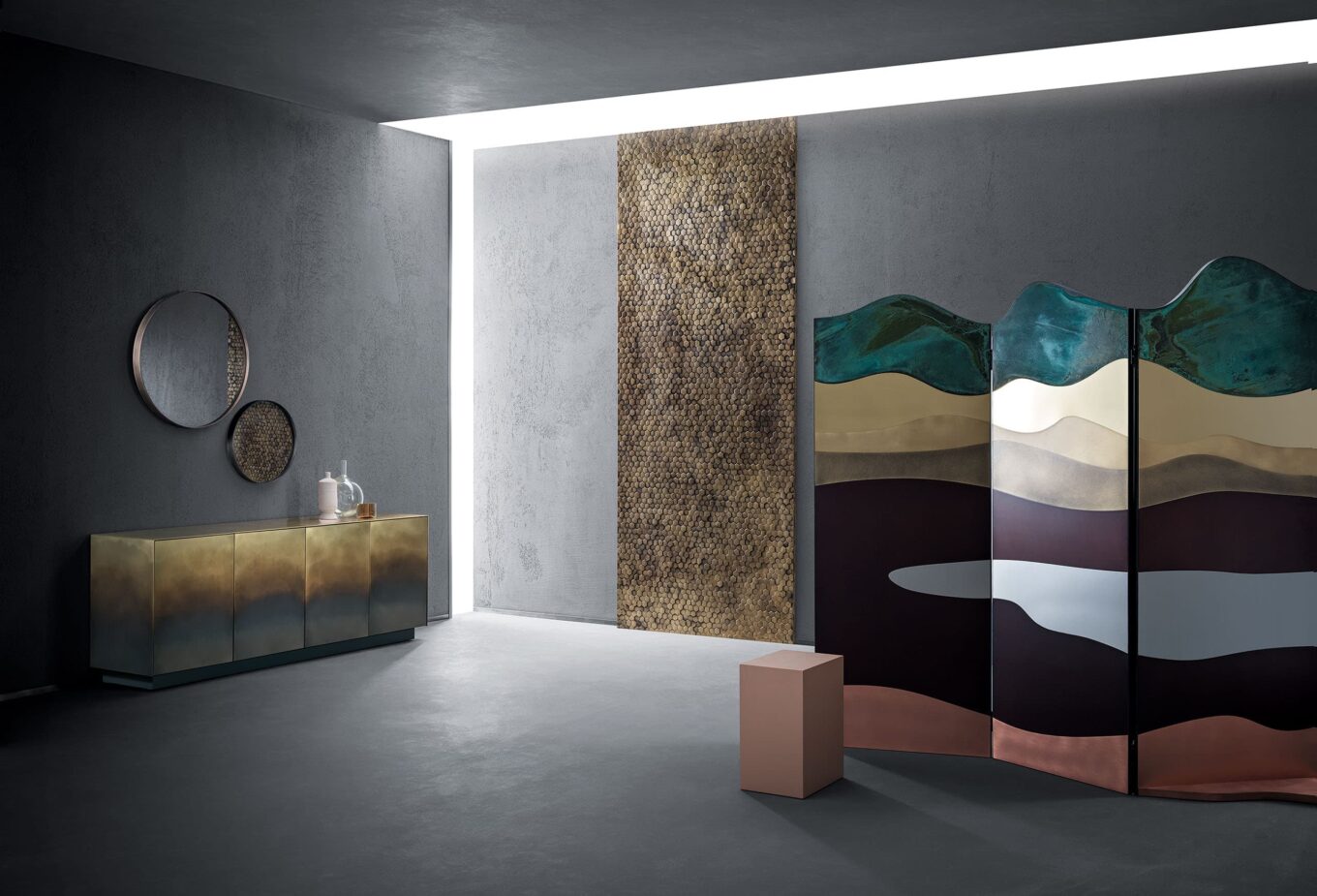 Для мастеров De Castelli каждый предмет или поверхность — результат творческого акта и научного подхода к изучению материалов, с которыми работает компания. Так в отделке объектов из коллекции Marea дизайнеры фабрики продемонстрировали, как поэтапное окисление меди может превратить плоскость мебельного фасада в живописное полотно с морским пейзажем и горячим закатным солнцем. В консоли Tako, разработанной Филиппо Пизаном, эффект градиента с мягкими переходами оттенков достигается благодаря технике DeErosion — контролируемой эрозии металла. Рельеф поверхности консоли с шевронным рисунком выполнен с помощью гравировки. Тумбы из коллекции Alchemy, разработанные итальянской студией Stormo, демонстрируют, как гладкая полированная нержавеющая сталь работает на изогнутых поверхностях. В системе облицовки Circle Wall представлена широкая палитра вариаций обработки латуни. Здесь сатинированный, полированный и оксидированный металл комбинируются в хаотичной последовательности, превращая поверхность в «лоскутное одеяло» из золотых, бронзовых и темно-коричневых фрагментов.