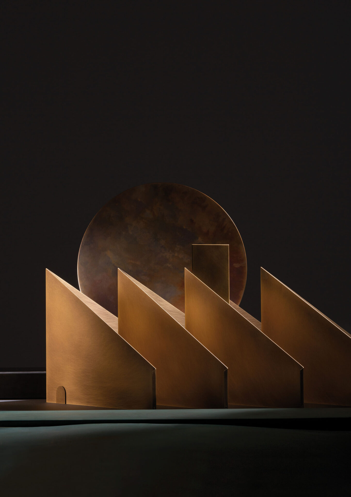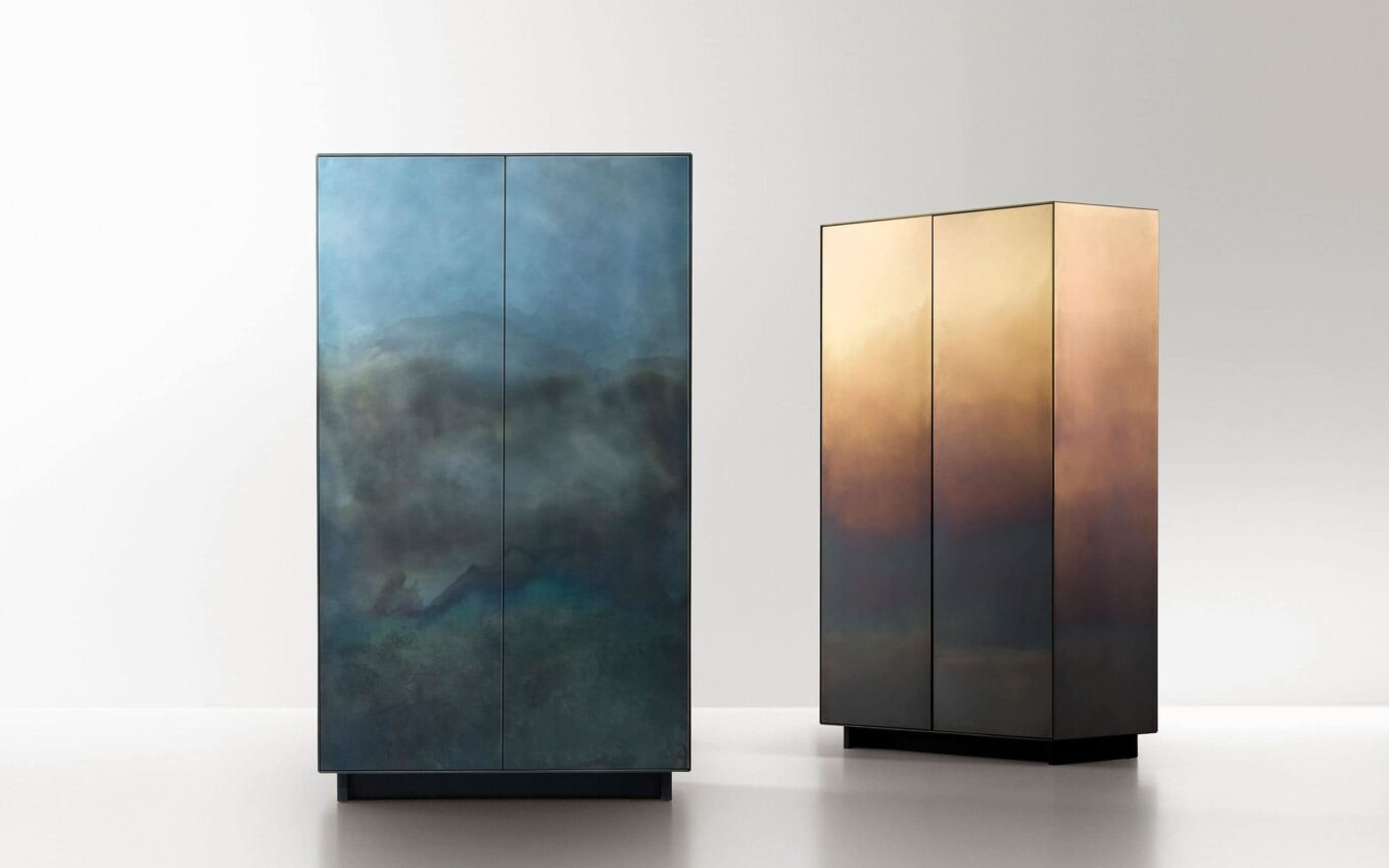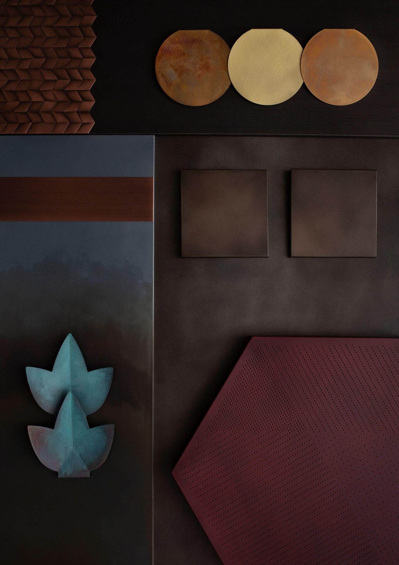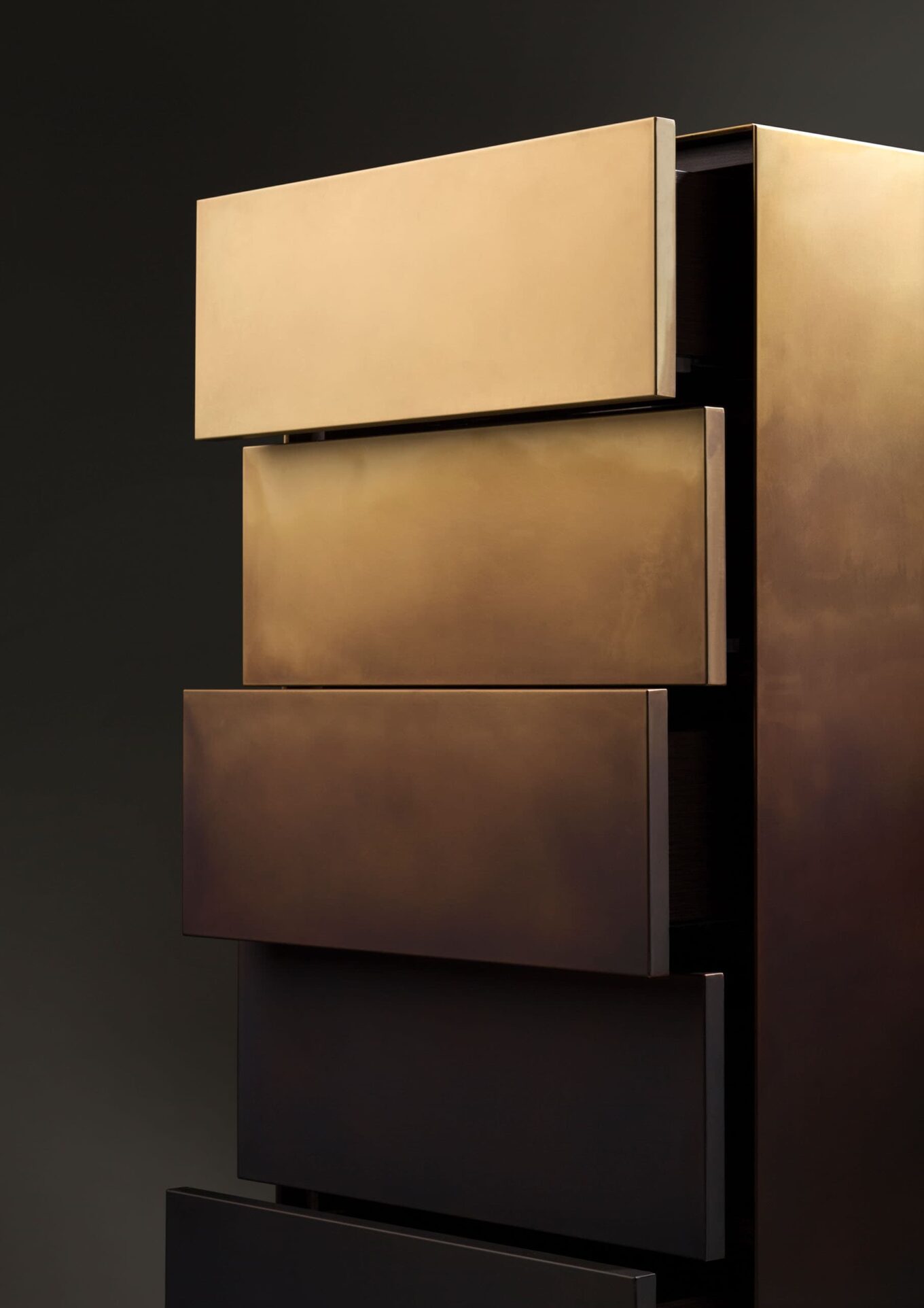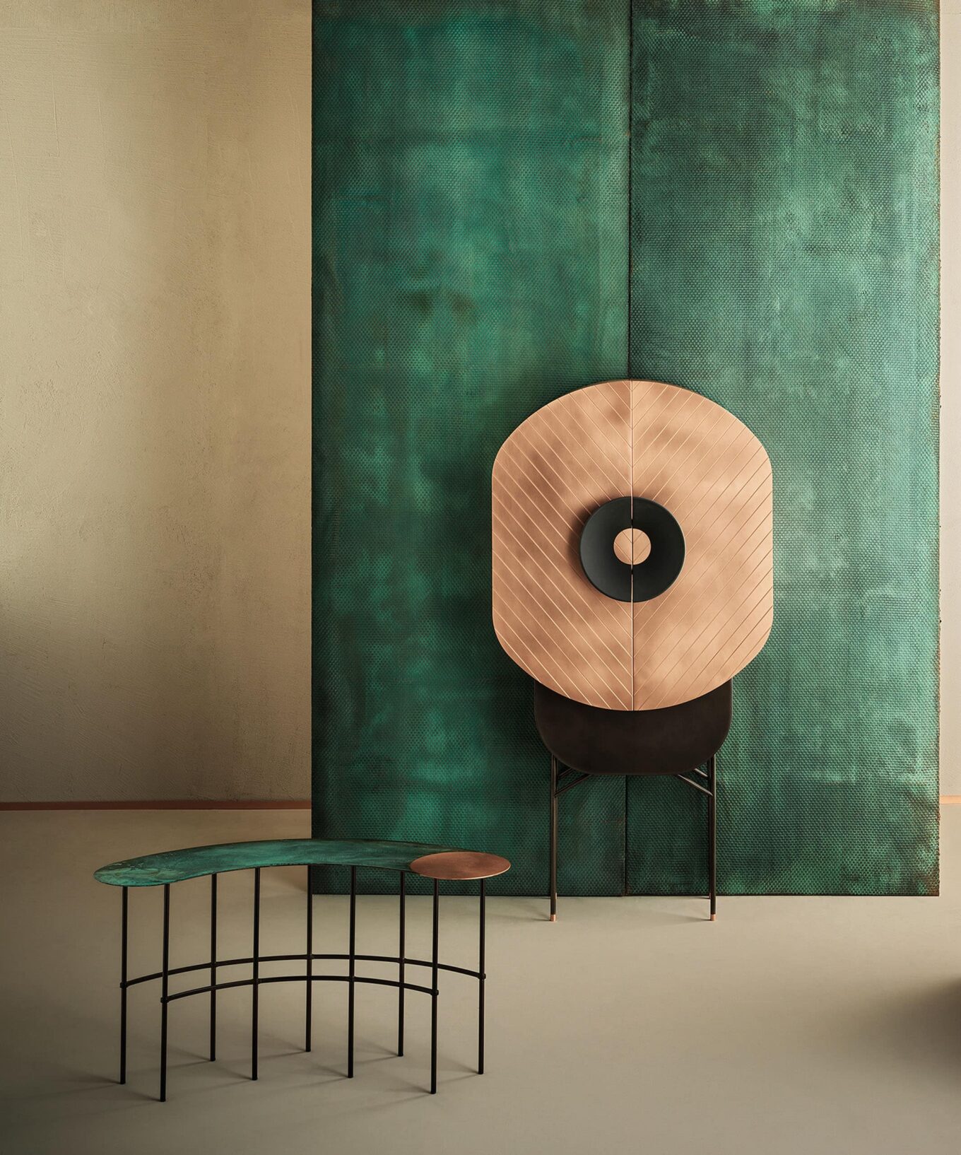 Для мастеров De Castelli каждый предмет или поверхность — результат творческого акта и научного подхода к изучению материалов, с которыми работает компания. Так в отделке объектов из коллекции Marea дизайнеры фабрики продемонстрировали, как поэтапное окисление меди может превратить плоскость мебельного фасада в живописное полотно с морским пейзажем и горячим закатным солнцем. В консоли Tako, разработанной Филиппо Пизаном, эффект градиента с мягкими переходами оттенков достигается благодаря технике DeErosion — контролируемой эрозии металла. Рельеф поверхности консоли с шевронным рисунком выполнен с помощью гравировки. Тумбы из коллекции Alchemy, разработанные итальянской студией Stormo, демонстрируют, как гладкая полированная нержавеющая сталь работает на изогнутых поверхностях. В системе облицовки Circle Wall представлена широкая палитра вариаций обработки латуни. Здесь сатинированный, полированный и оксидированный металл комбинируются в хаотичной последовательности, превращая поверхность в «лоскутное одеяло» из золотых, бронзовых и темно-коричневых фрагментов.