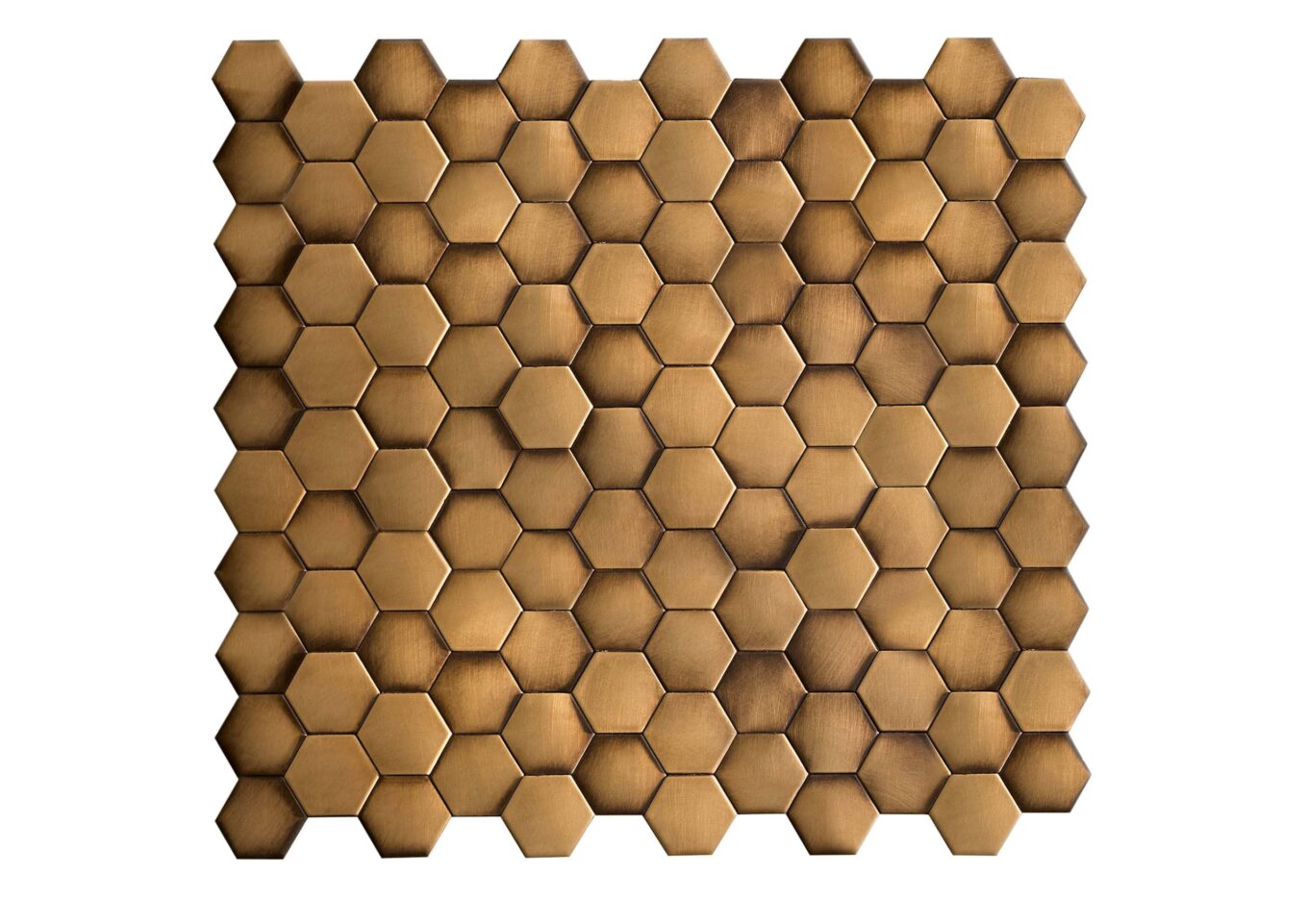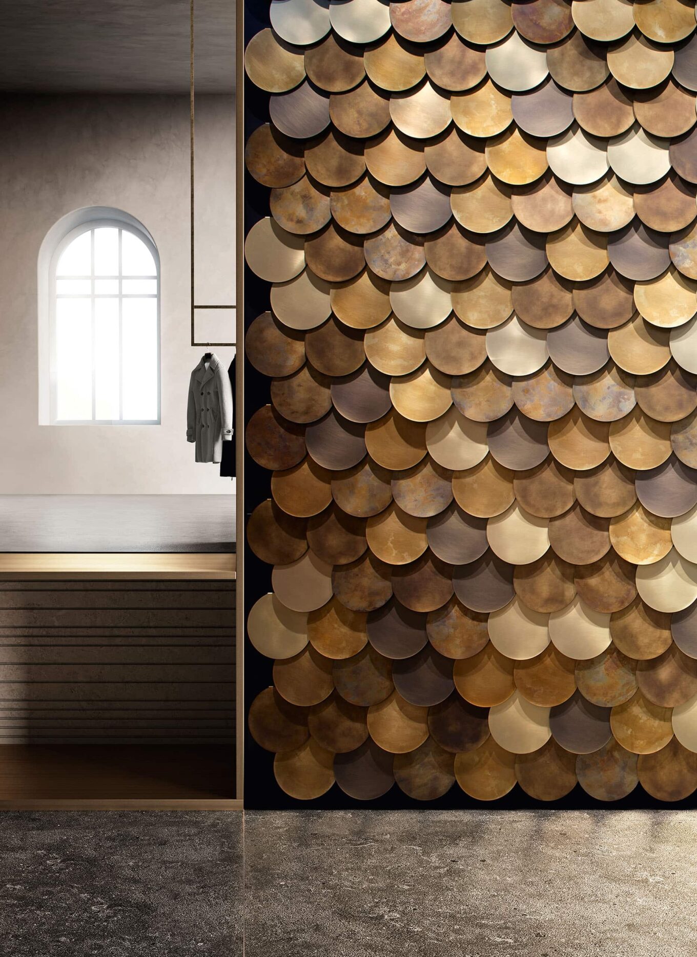 В системе облицовки Circle Wall сатинированная, полированная и оксидированная латунь комбинируется в хаотичной последовательности, превращая поверхность в «лоскутное одеяло» из золотых, бронзовых и темно-коричневых фрагментов