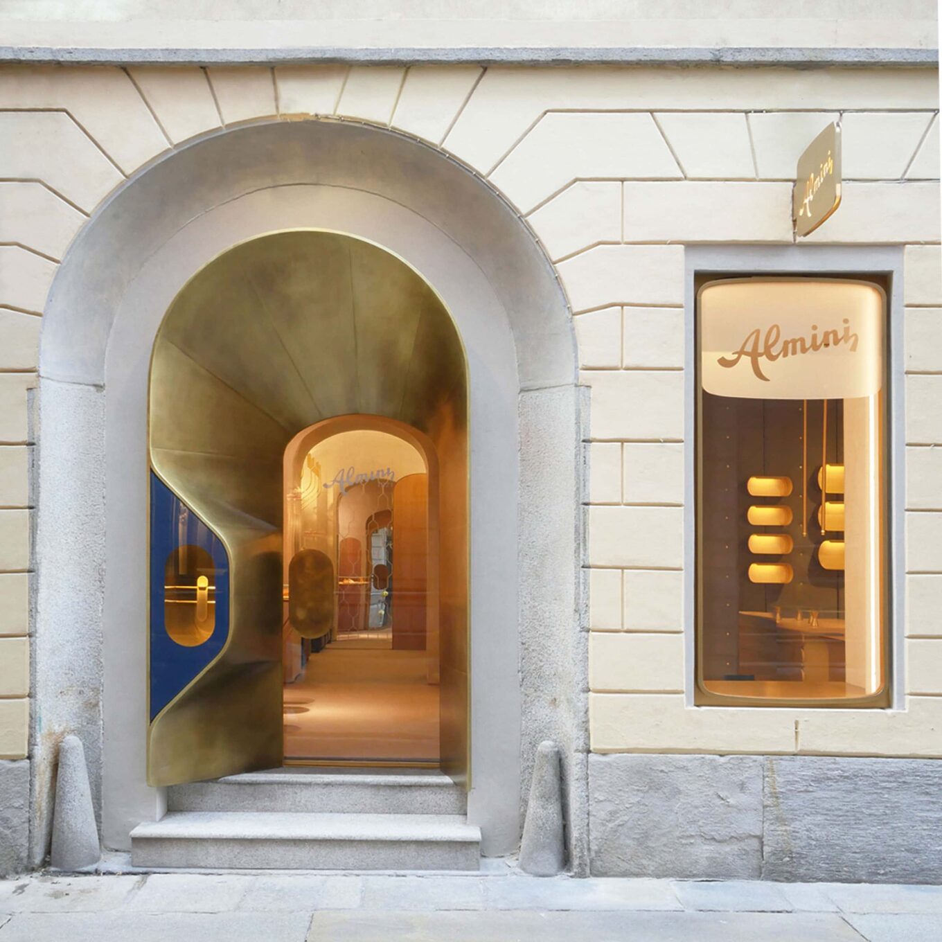Этот проект не единственный, где Дзукки создает портал в предшествующие эпохи. В творческом союзе с De Castelli архитектор разработал входную группу в магазин Almini в Милане, который расположен в историческом здании. Дзукки артикулировал вход, решив его в виде латунного пассажа с изломанной перспективой — такой же метод использовал Франческо Борромини в Палаццо Спада в Риме. Края интегрированного в тело здания «туннеля» выступают за плоскость фасада, и это создает приглашающий эффект. Кроме того, архитектор сместил ось симметрии композиции, уменьшил существующую арку, словно отразив ее в кривых зеркалах. Подобная интерпретация вызывает яркую эмоциональную архитектурную иллюзию, не оскорбляя историко-культурный контекст, но подчеркивая особенную эстетику Almini, выраженную благодаря богатству металлической фактуры.