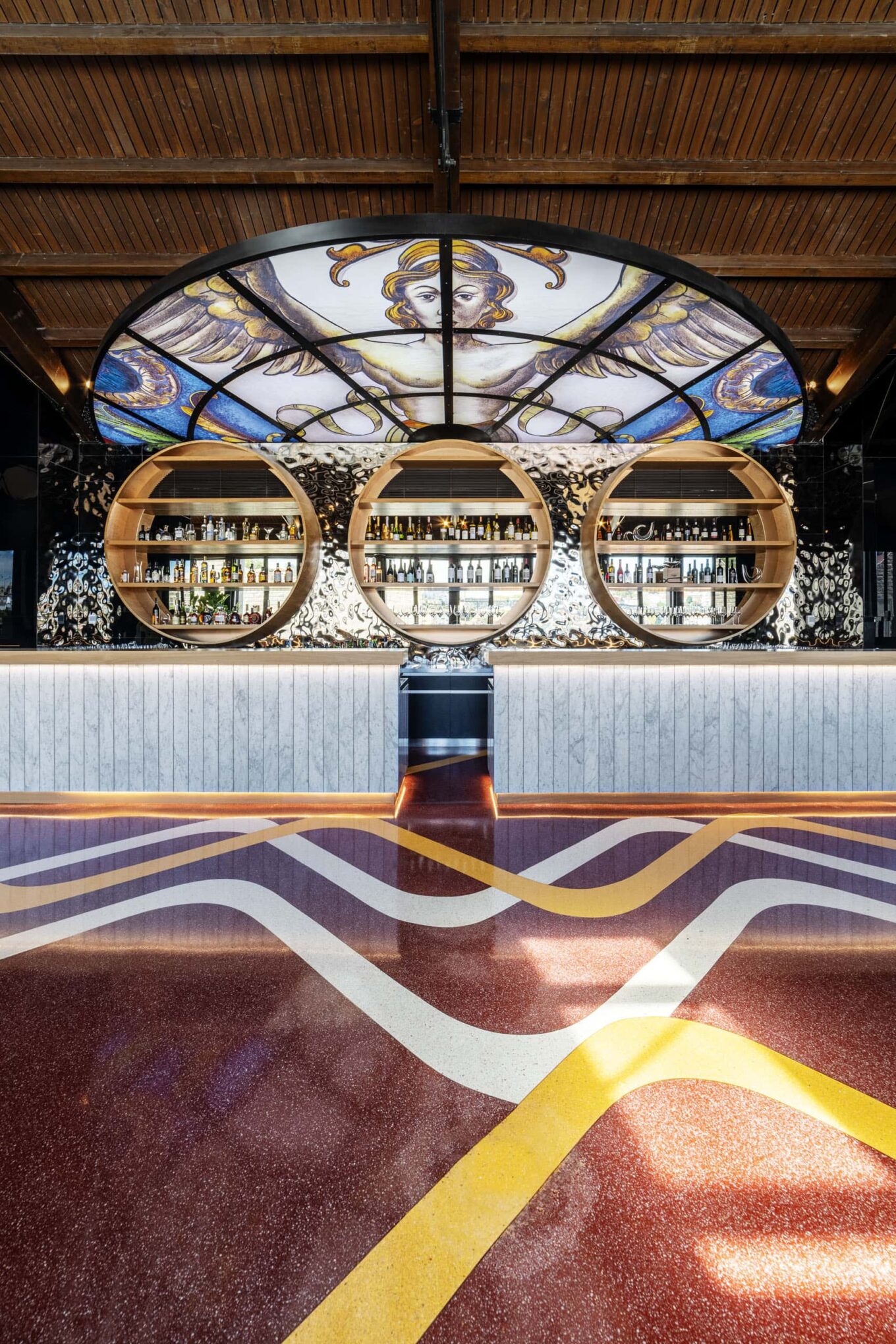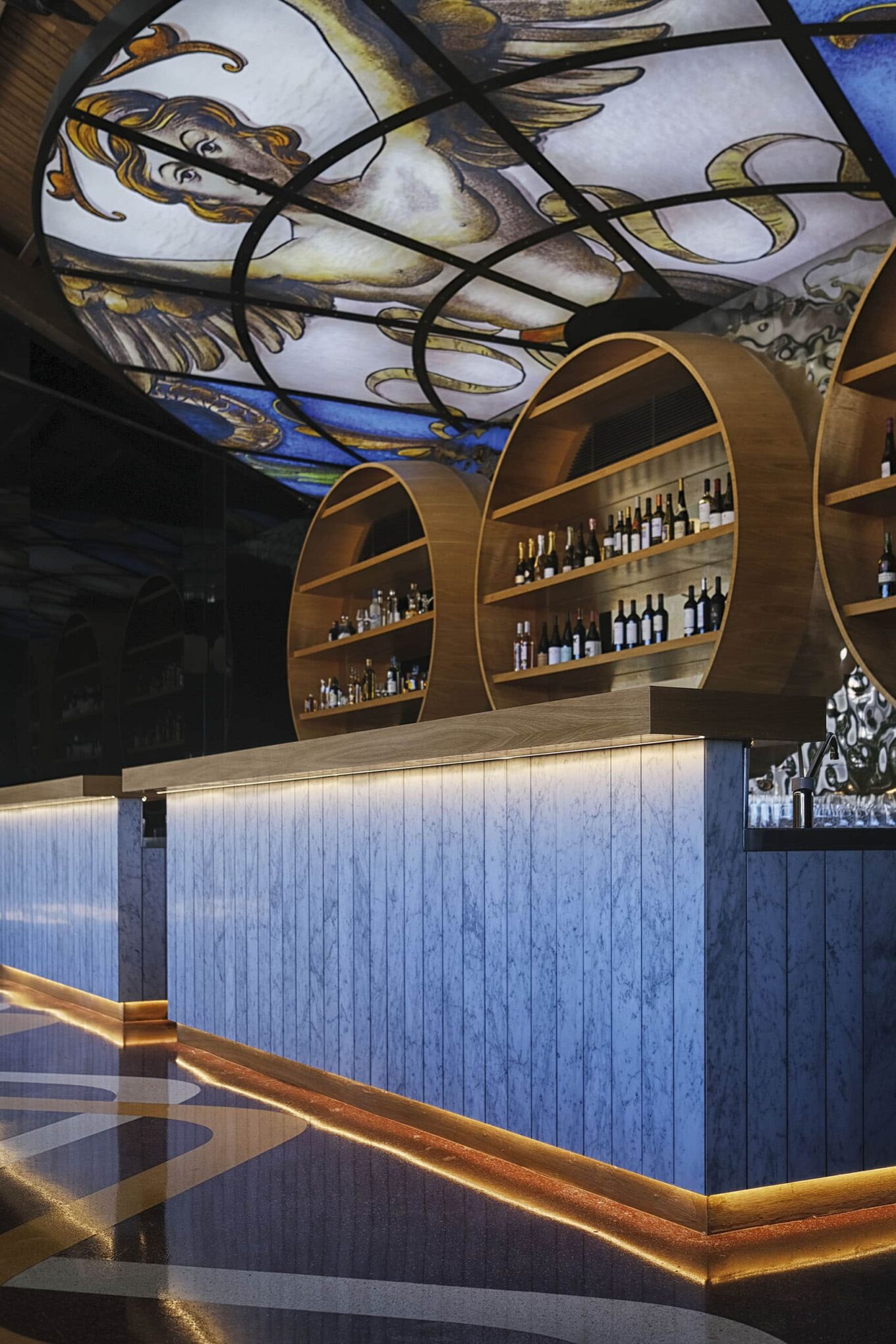 Изюминка интерьера винного бара Angel’s Share — огромный витраж ручной работы