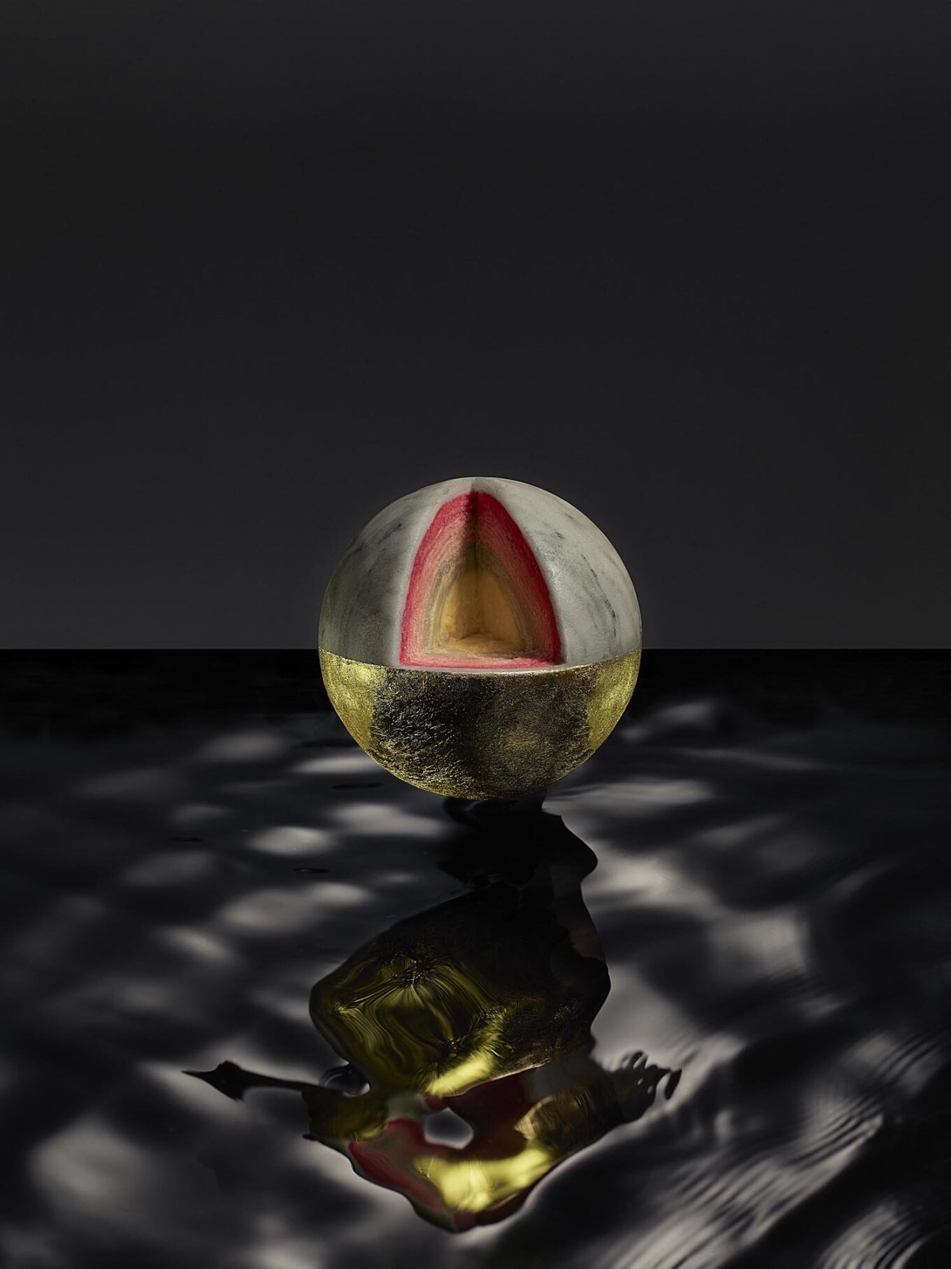 Под марморизированным марципаном этого десерта, которому с легкой руки автора придана фотографическая схожесть то с полированной поверхностью камня из Каррары, то с матовой зернистостью гранита, то со стеклянным отблеском полупрозрачного оникса, скрываются несколько слоев бисквита или вафли и крем на основе миндальной пасты. Сама Киа называет свои авангардные сладости традиционным датским десертом flødeboller – флёдеболлер.