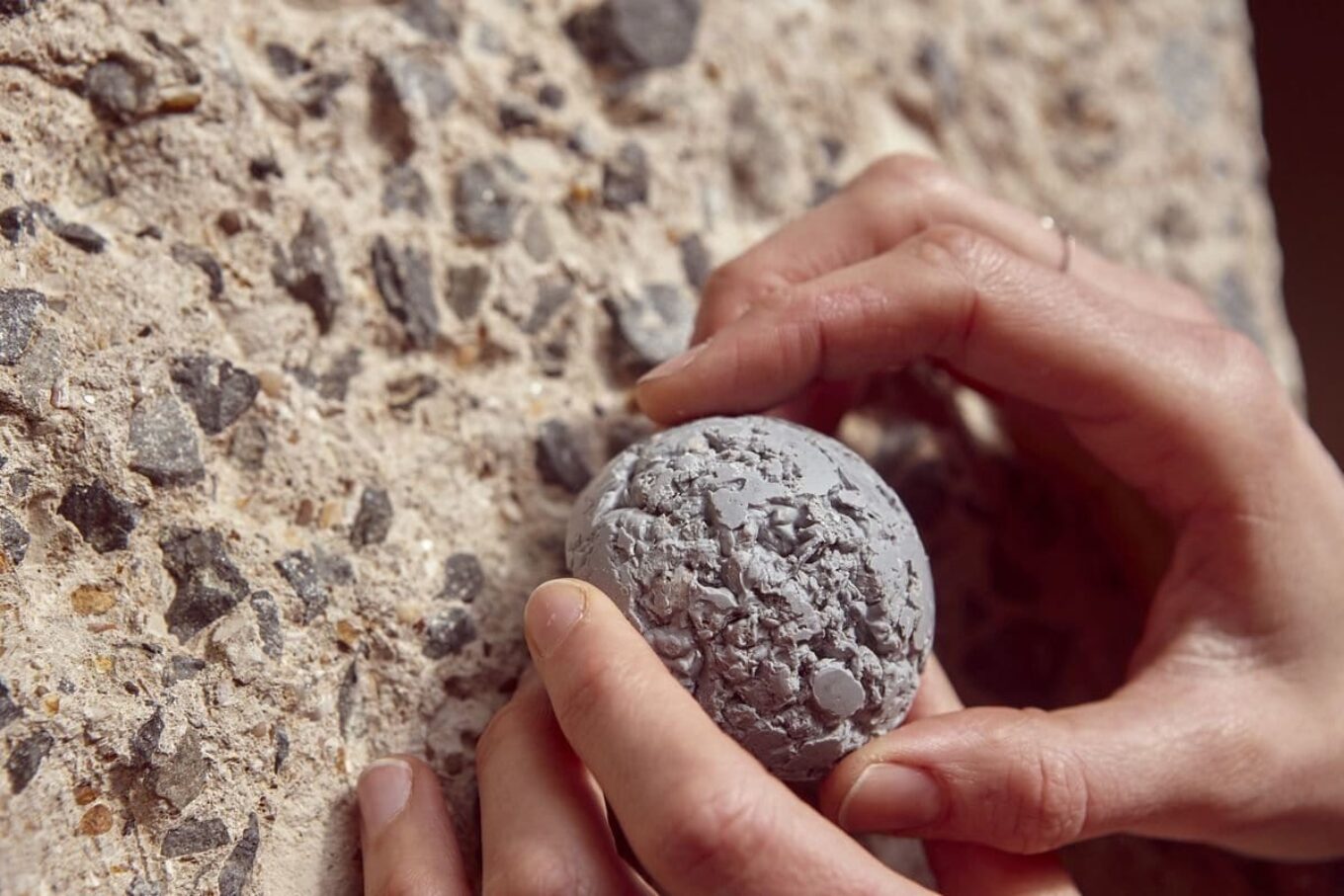 Автор приоткрывает секрет мастерства, объясняя, что разных оттенков «бетонной глазури» она добивается, вводя натуральные красители – пищевой уголь и кунжутное семя. В поиске идеальной формулы ювелир провела на кухне несколько дней!