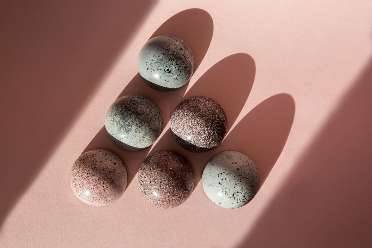 Под марморизированным марципаном этого десерта, которому с легкой руки автора придана фотографическая схожесть то с полированной поверхностью камня из Каррары, то с матовой зернистостью гранита, то со стеклянным отблеском полупрозрачного оникса, скрываются несколько слоев бисквита или вафли и крем на основе миндальной пасты. Сама Киа называет свои авангардные сладости традиционным датским десертом flødeboller – флёдеболлер.