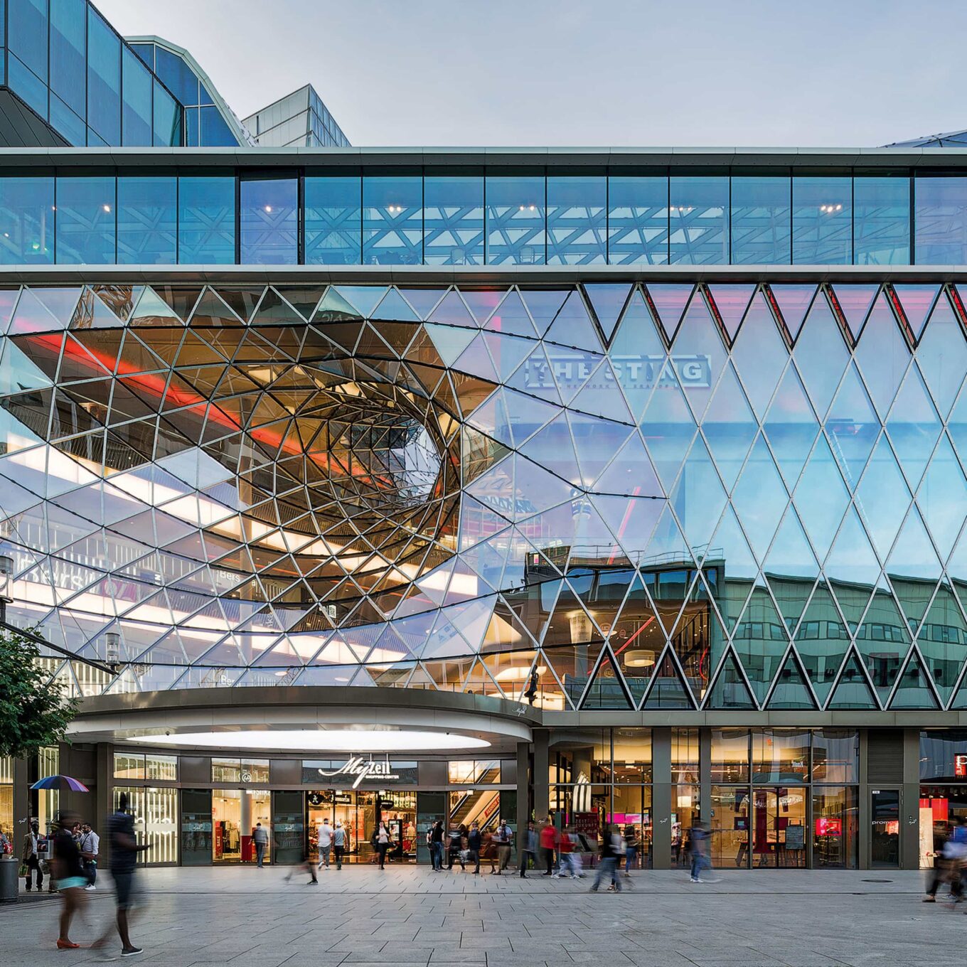 Торговий центр MyZeil у Франкфурті-на-Майні, 2010 р. Воронка на фасаді переходить в «улоговину» між двома скляними пагорбами на даху будівлі. Якщо слово My, тобто «мій», перекласти німецькою, то виявиться, що в назві молла зашифроване ім’я річки, на якій стоїть місто, що надихнуло цей проєкт. Фото: Fabio Lovino, Jonathan Reid
