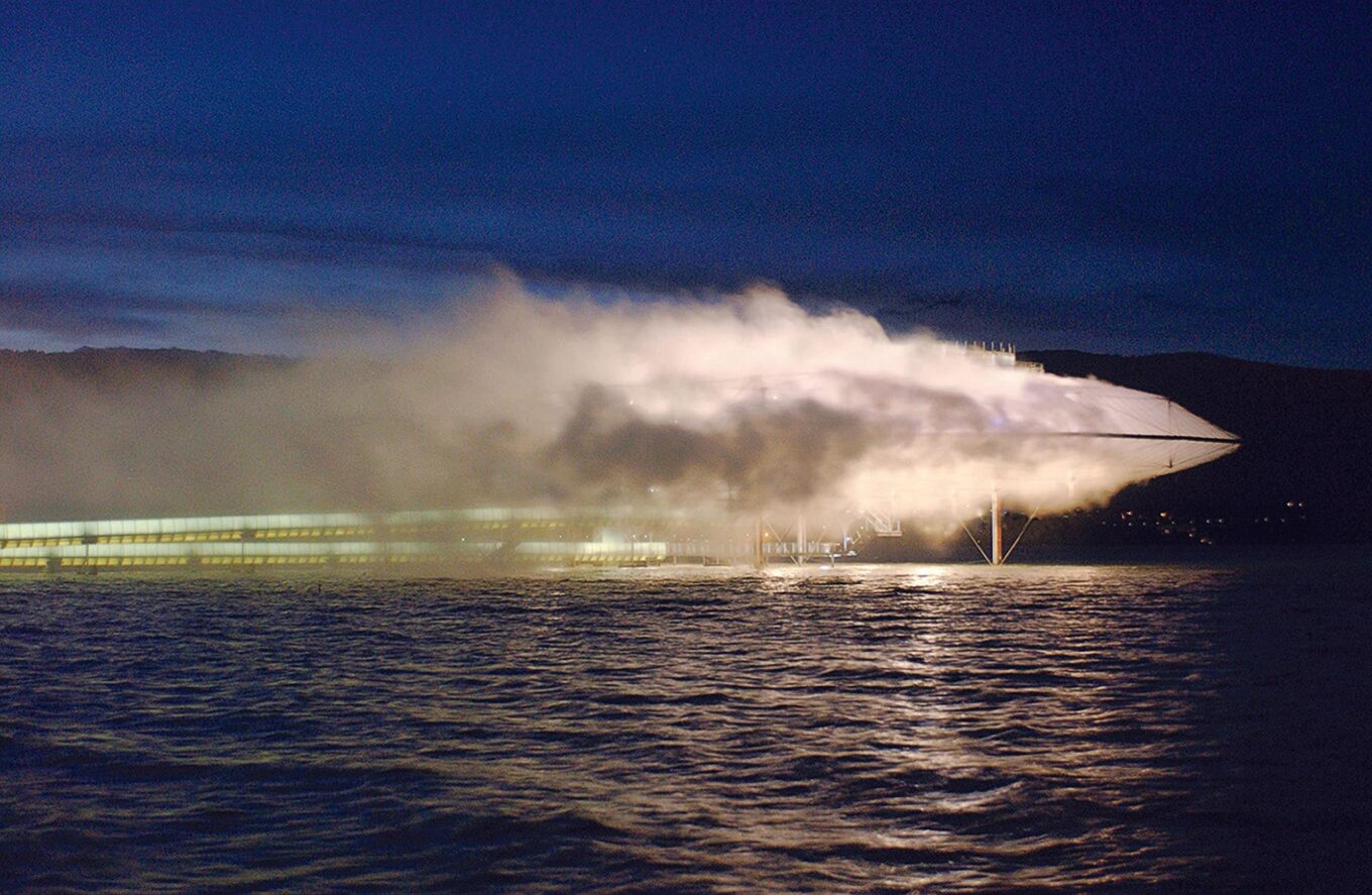 Проєкт Blur Building на Невшательському озері у швейцарському місті Івердон-ле-Бен. Це тимчасовий медіапавільйон, зведений у рамках виставки Swiss Expo 2002. Джерело фото: www.dillerscofidio.com