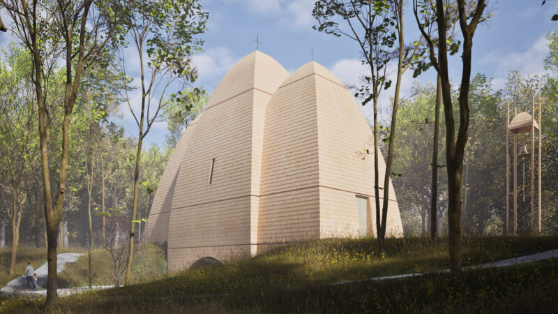Такий вигляд матиме новий православний храм Ікони Пресвятої Богородиці Скоропослушниці у Львові, який планують побудувати після війни. Проєкт Guess Line Architects посів перше місце у всеукраїнському конкурсі. Візуалізація: Guess Line Architects