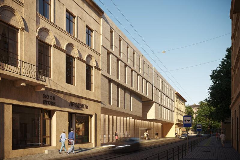 А. Л.: Це проєкт, який ми подавали на закритий архітектурний конкурс від «Ковальської». Наше бюро взяло в у ньому п’яте місце, проєкт не буде реалізовуватись. Ми вирішили спробувати в житлову архітектуру, але зрозуміли, що це не зовсім наша історія. Звісно, ми можемо зробити крутий житловий будинок, але нам цікавіше працювати в ніші контекстуальної громадської архітектури.