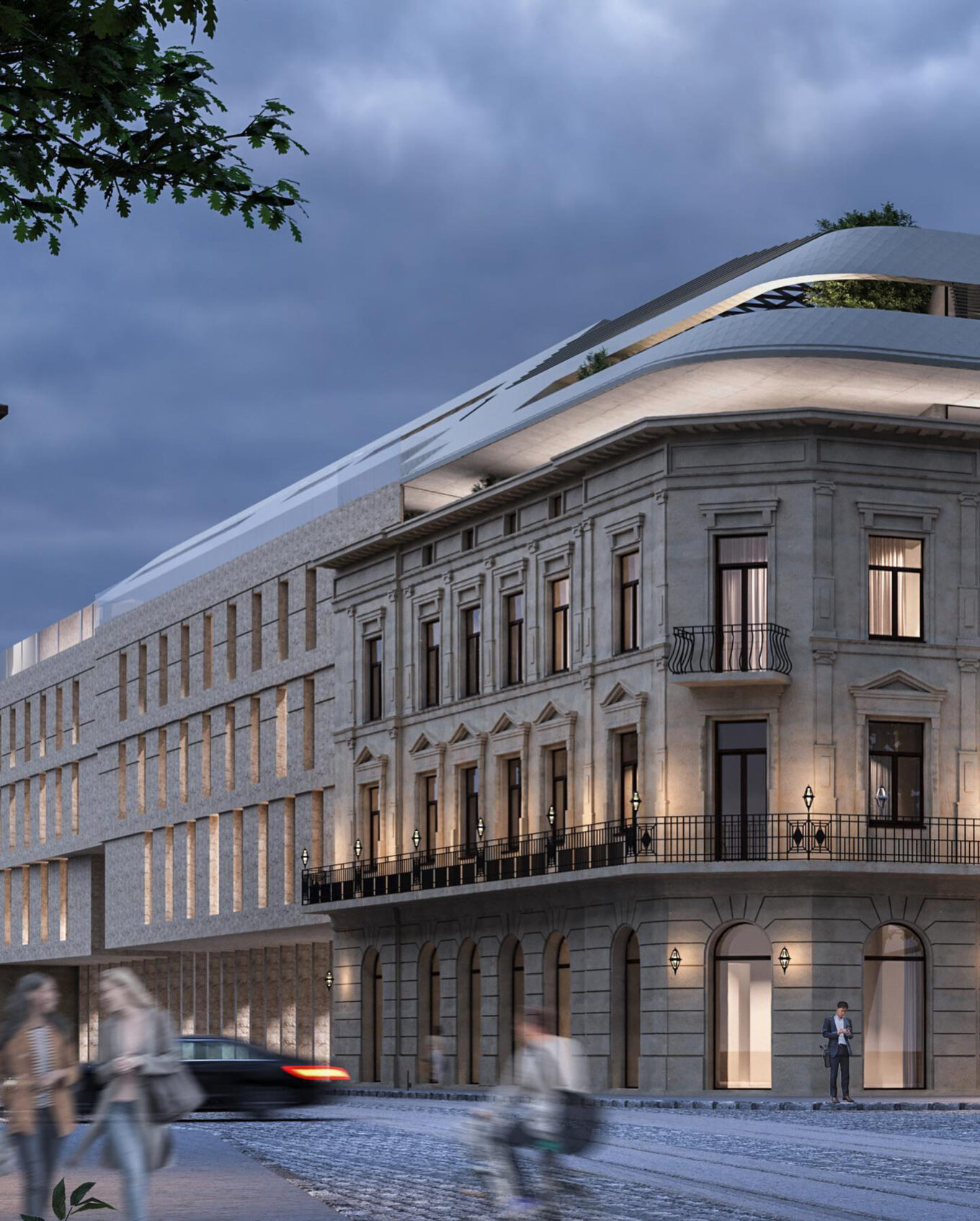Андрій Лесюк: Одним із головних завдань конкурсу було збереження громадського простору, який утворився навколо зупинки. Людям подобається цей шматок території, де вони навіть очікують на когось. Дуже важливо було не порушувати габаритів цієї зони. Ми візуалізували багато концепцій і зрештою наважились на сміливе рішення — проєктувати консоль, щоб підняти другий, третій і четвертий поверхи готелю над зупинкою, аби на рівні «партеру» з’явилось більше простору. Інших учасників, підозрюю, погубило те, що вони використовували там колони чи ігнорували цю умову. Ми ж перемогли, на мою думку, завдяки консолі, яка відповідала технічному завданню конкурсу. Загалом проєкт підійшов замовникові, й він згодився на додаткові витрати заради консолі, яка дозволяла віддати простір вулиці для людей. Замовник не втручався в архітектуру та не вимагав змін до проєкту, а дозволив його реалізувати саме так, як було задумано. Це насправді дуже велика рідкість.