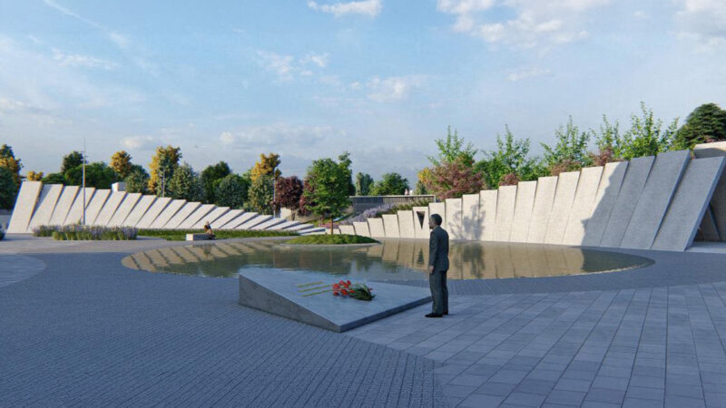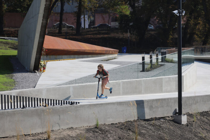 P.M.: Згідно з проєктом, Меморіал мав складатись із двох частин: кортенової стели, яка врізається в пагорб (вона вже побудована. — Прим. ред.), і пішохідного мосту, який би з’єднував пам’ятне місце з парком через вулицю Кривоноса. Чому досі не побудували міст?