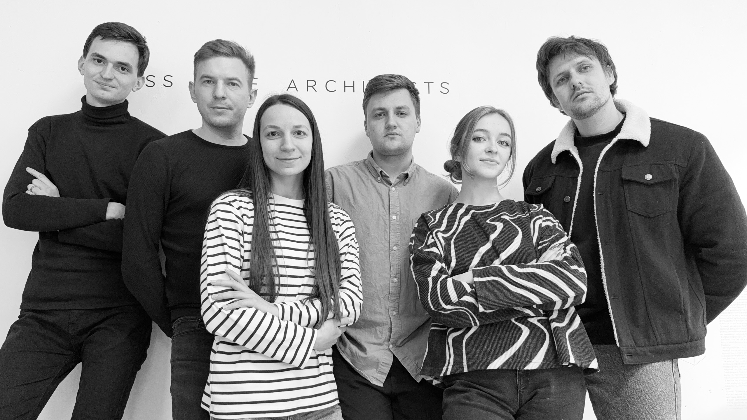 Склад бюро Guess Line Architects у 2025 році, зліва направо: Єгор Перепелюк, Андрій Лесюк, Катерина Іващук, Ярослав Іваськів, Анна Фітель та Михайло Когут. Фото надане Guess Line Architects