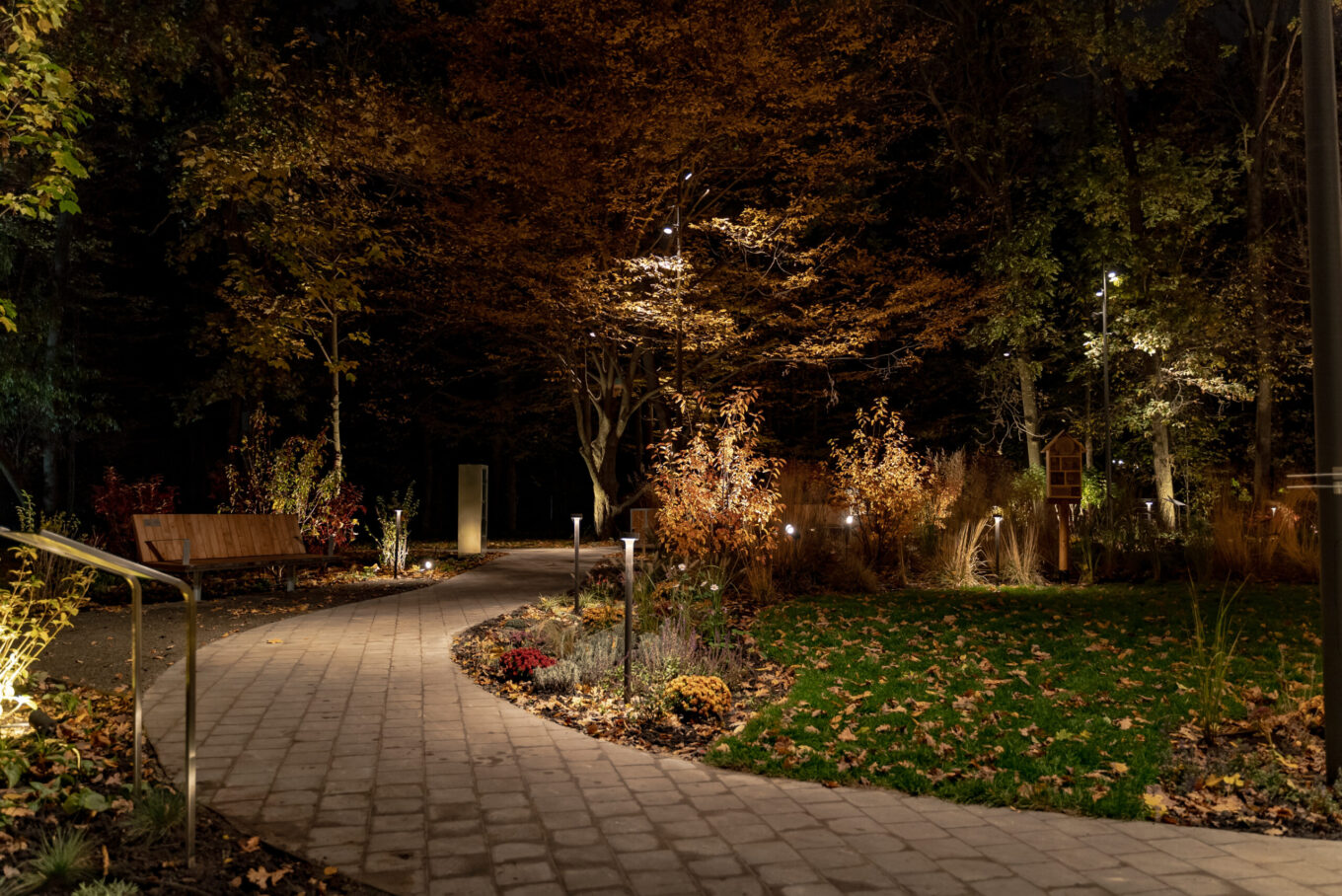 Для створення такого ефекту Expolight вивчала досвід японських і скандинавських садів. У проєкті використані світильники зі спеціальними трафаретами (гобо), що імітують природні тіні від гілок, а саме освітлення є динамічним і змінюватиметься відповідно до пір року.