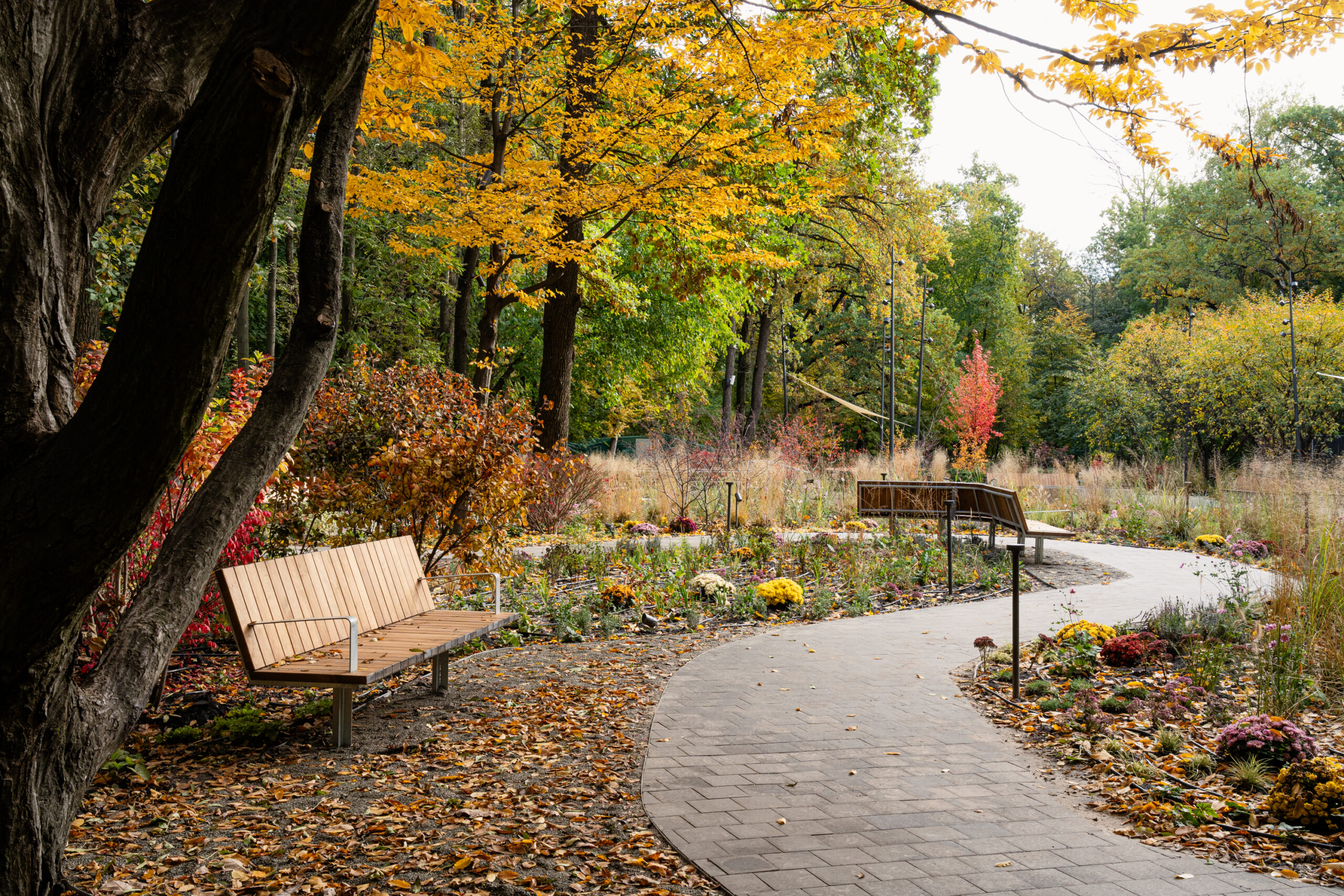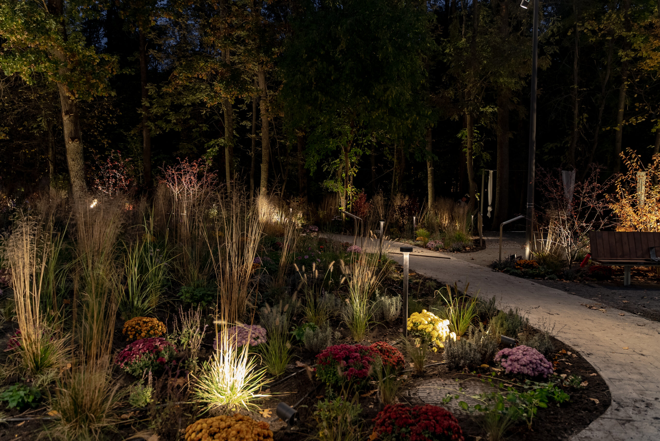 Для створення такого ефекту Expolight вивчала досвід японських і скандинавських садів. У проєкті використані світильники зі спеціальними трафаретами (гобо), що імітують природні тіні від гілок, а саме освітлення є динамічним і змінюватиметься відповідно до пір року.