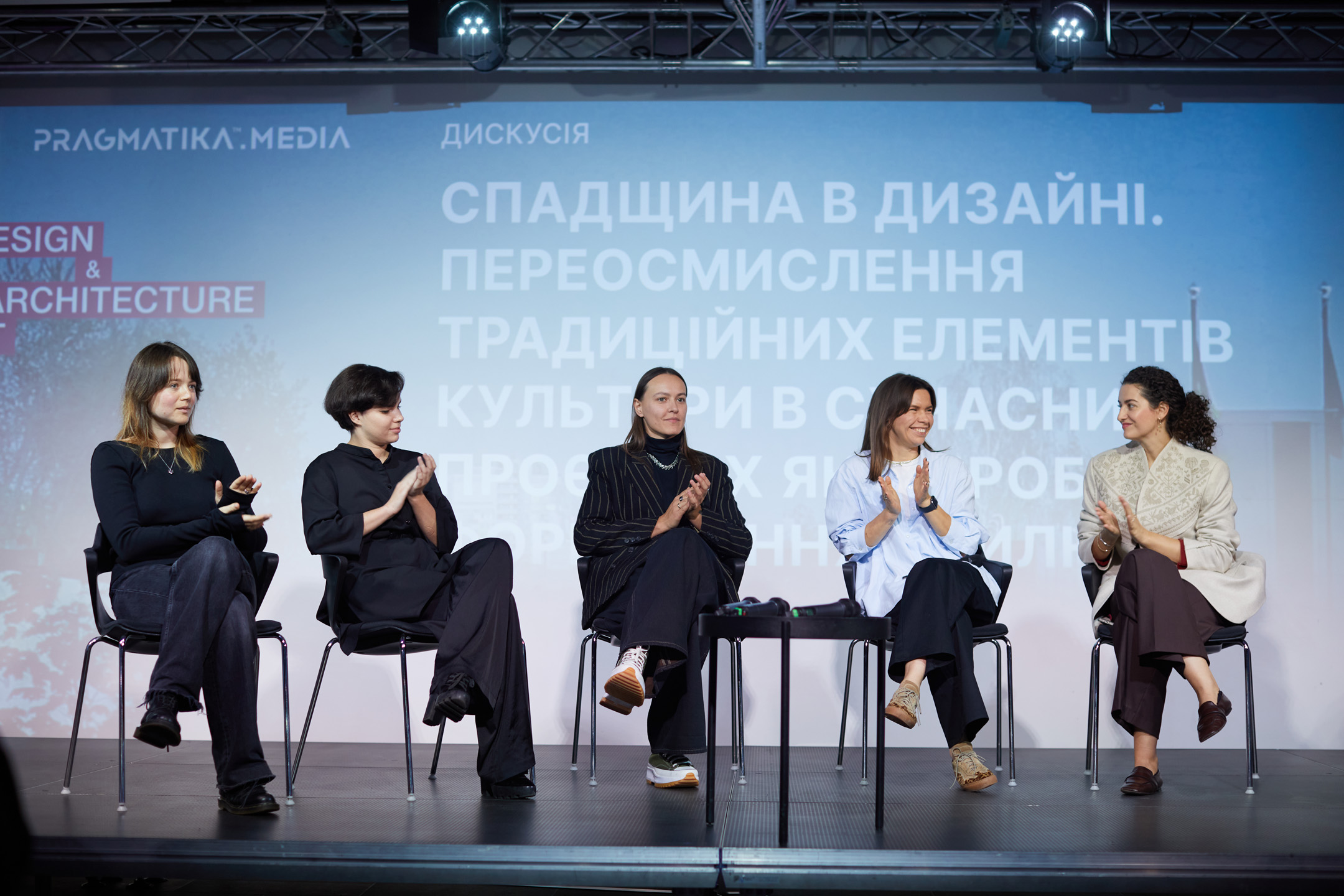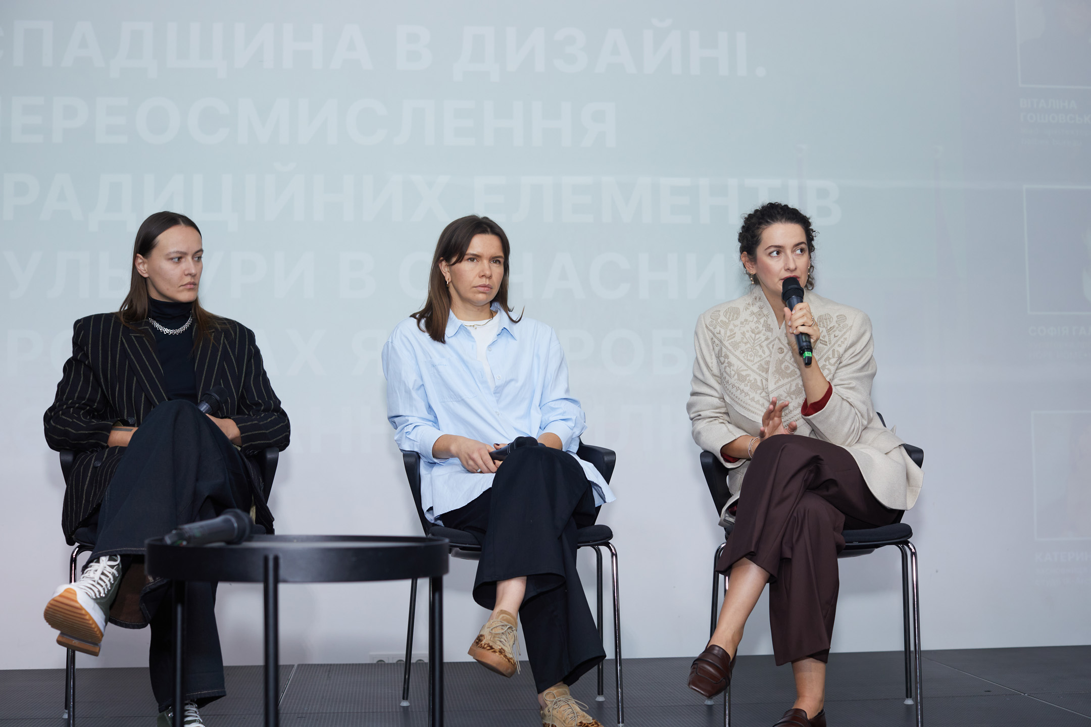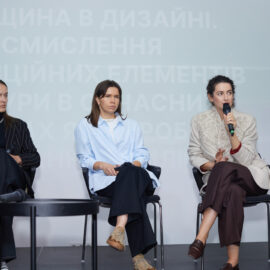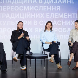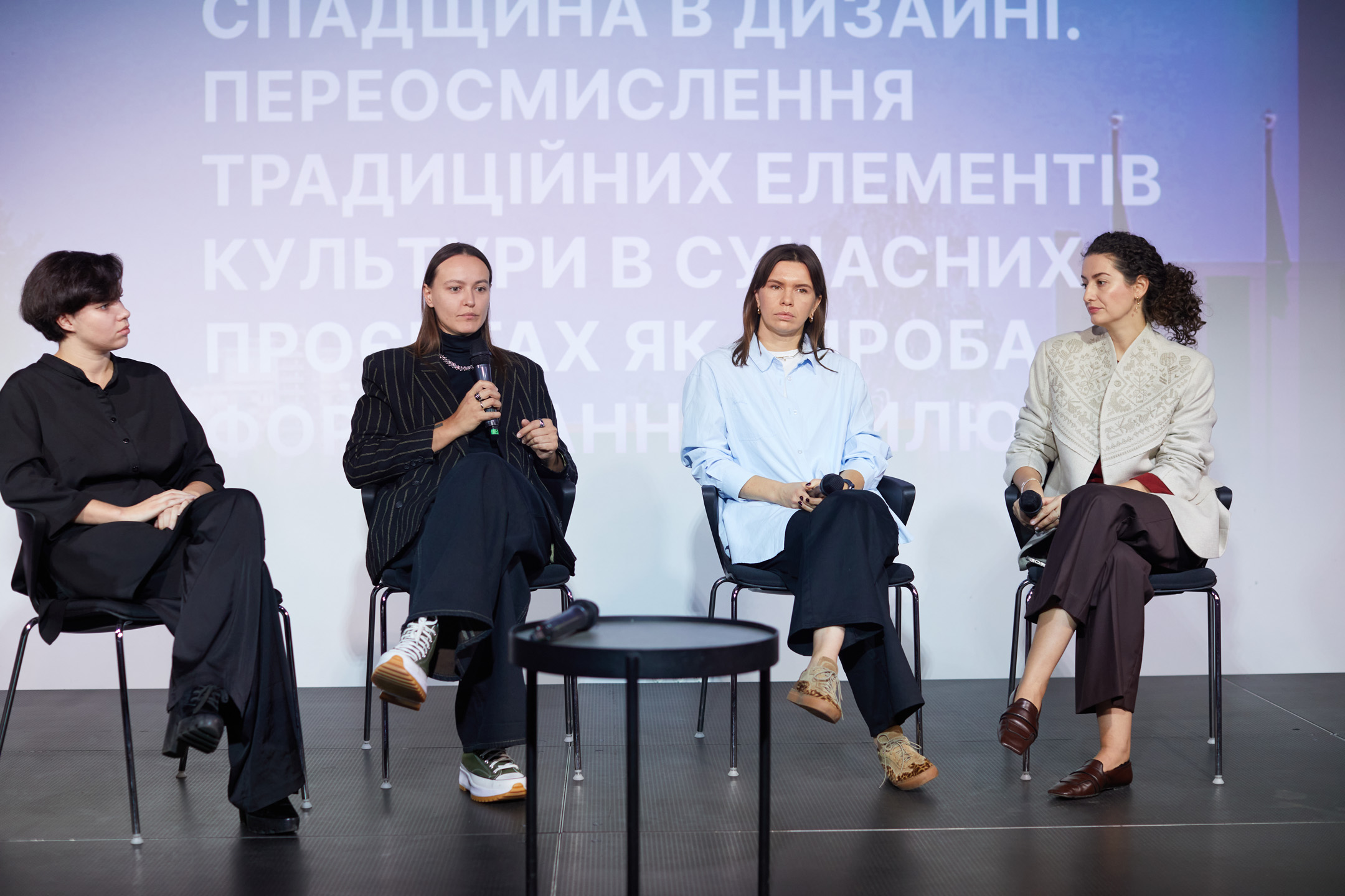 Завершальною стала дискусійна панель «Спадщина в дизайні. Переосмислення традиційних елементів культури в сучасних проєктах як спроба формування стилю». Обговорювали, до яких автентичних матеріалів і мотивів ми повертаємось у дизайні й архітектурі, як вони трансформувались за понад два роки війни та чи вдалось їм сформувати нову стилістику. Відповіді на питання шукали із засновницею архітектурної студії IK-architects Катею Яровою, lead-архітекторкою balbek bureau Віталіною Гошовською, засновницею дизайн-студії Between the Walls Вікторією Карєвою, власницею бренду автентичного одягу Gaptuvalnya Наталею Гергелюк та кураторкою проєкту «HOPE HOME•НАДІЯ» Софією Галат.
