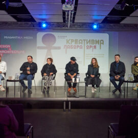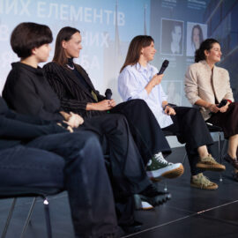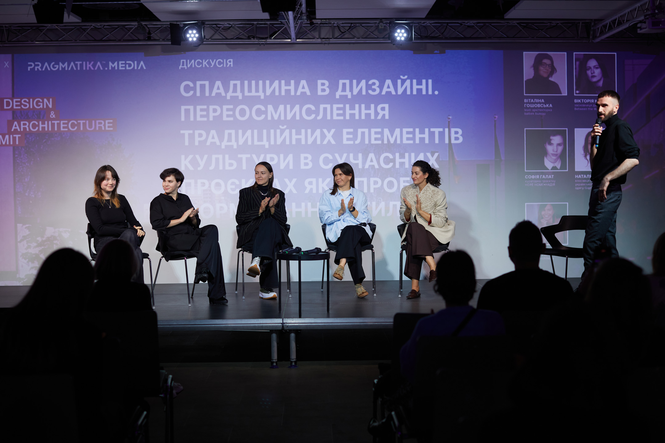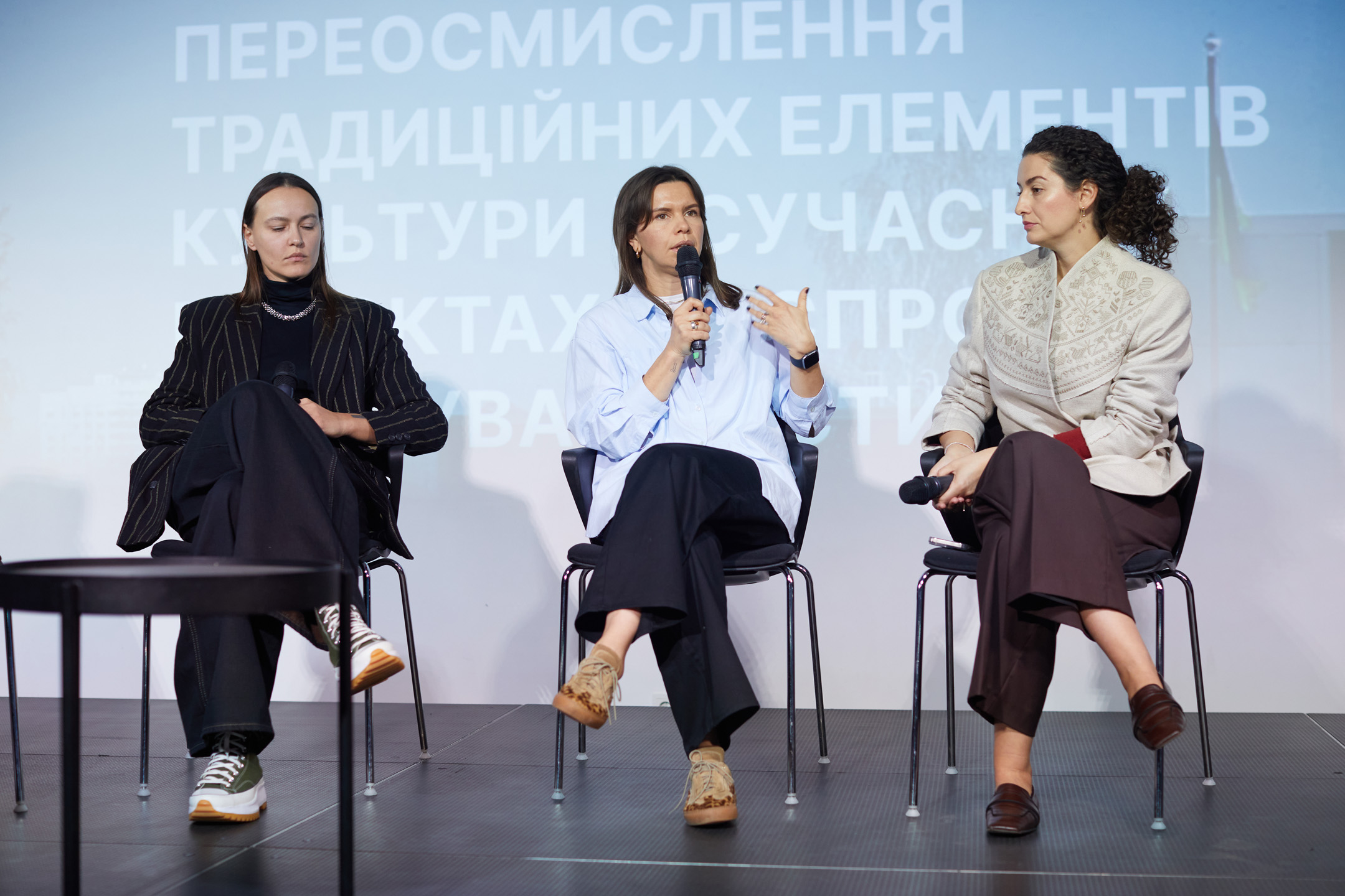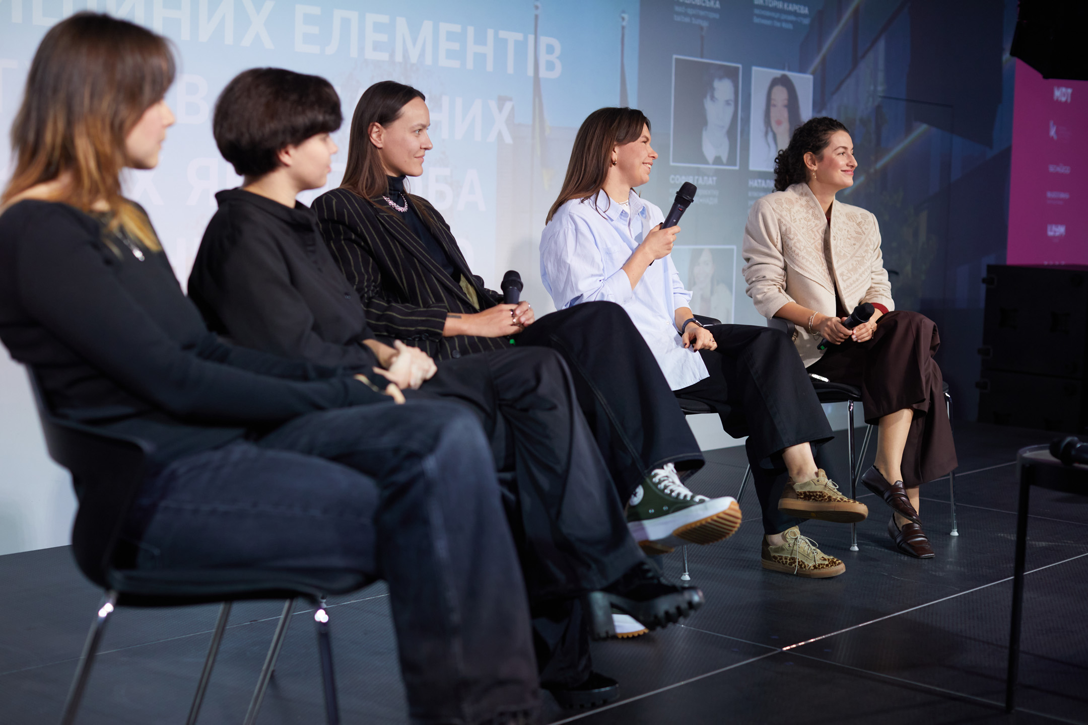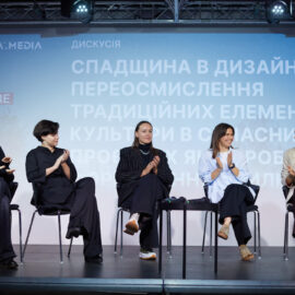 Завершальною стала дискусійна панель «Спадщина в дизайні. Переосмислення традиційних елементів культури в сучасних проєктах як спроба формування стилю». Обговорювали, до яких автентичних матеріалів і мотивів ми повертаємось у дизайні й архітектурі, як вони трансформувались за понад два роки війни та чи вдалось їм сформувати нову стилістику. Відповіді на питання шукали із засновницею архітектурної студії IK-architects Катею Яровою, lead-архітекторкою balbek bureau Віталіною Гошовською, засновницею дизайн-студії Between the Walls Вікторією Карєвою, власницею бренду автентичного одягу Gaptuvalnya Наталею Гергелюк та кураторкою проєкту «HOPE HOME•НАДІЯ» Софією Галат.