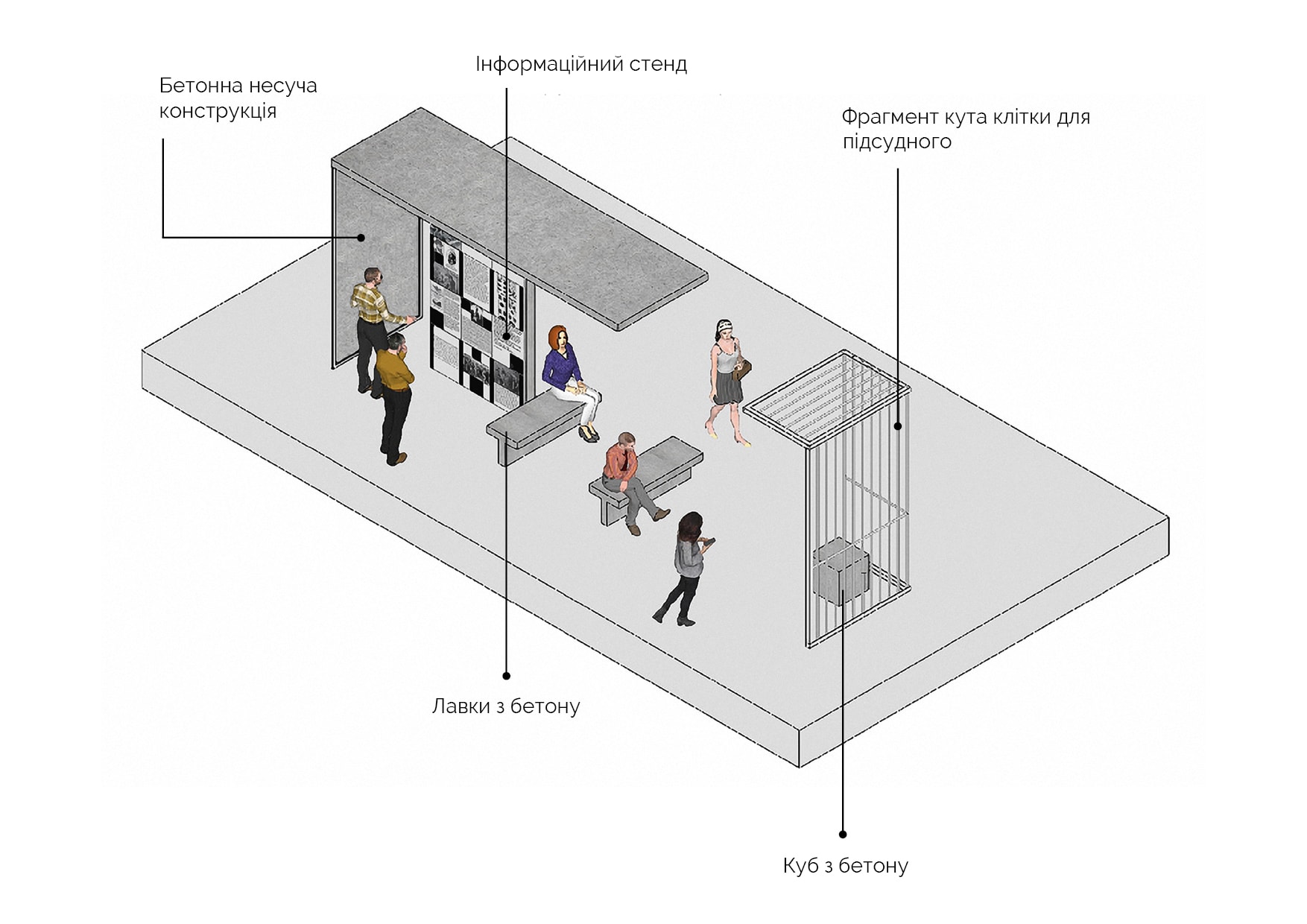 Що ж унікального в формі цієї зупинки? Своїм витвором Анна Звягінцева пропонує всім охочим відчути себе на лаві підсудного або присяжних. І нагадує: на їхньому місці може опинитися кожен.
