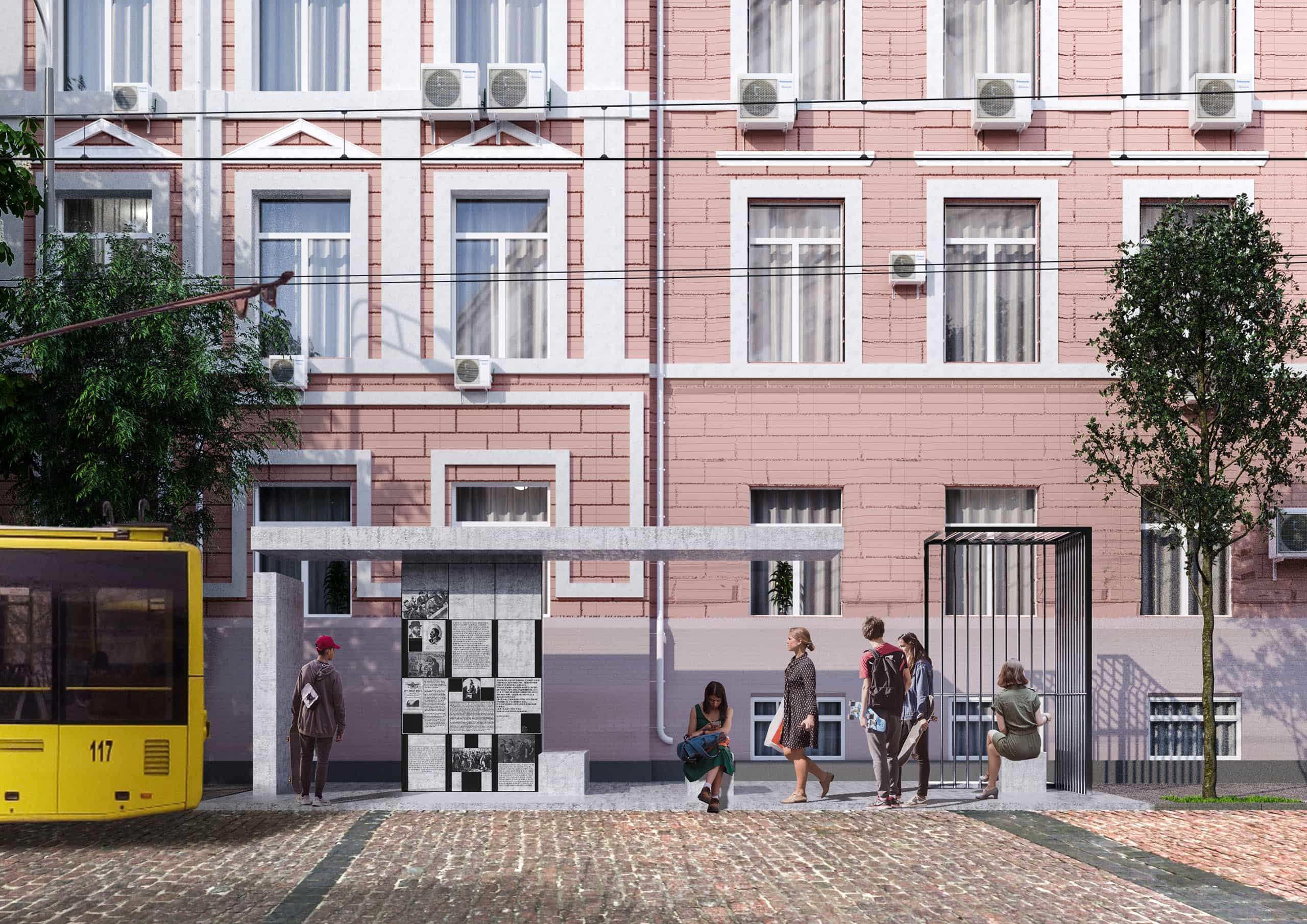 Проєкт пам’ятного знака про справу Бейліса. Авторка: Анна Звягінцева. Архітектурні рішення: бюро «ФОРМА». Графічне рішення модульної сітки з інформацією: Альона Соломадіна