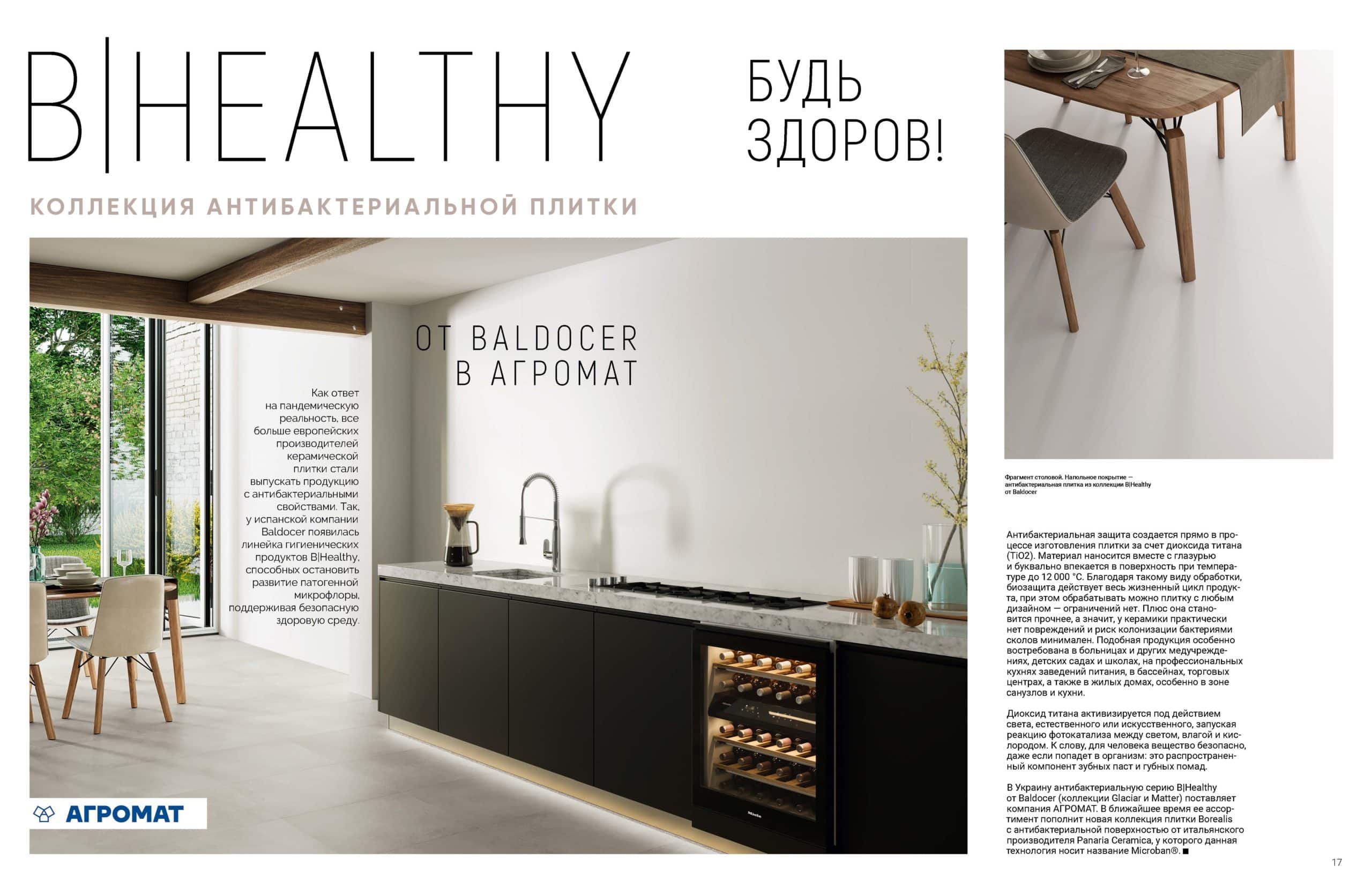 В Украину антибактериальную серию B|Healthy от Baldocer (коллекции Glaciar и Matter) поставляет компания АГРОМАТ. В ближайшее время ее ассортимент пополнит новая коллекция плитки Borealis с антибактериальной поверхностью от итальянского производителя Panaria Ceramica, у которого данная технология носит название Microban®.