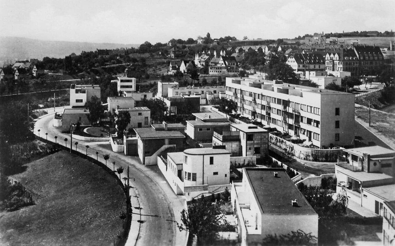 Жилой поселок Вайсенхоф (Weißenhofsiedlung) в Штутгарте на архивном фото, 1925—1927 гг. Над его проектированием работал Людвиг Мис ван дер Роэ и ряд других известных архитекторов. Построен в 1927 г. к выставке Веркбунда в Штутгарте