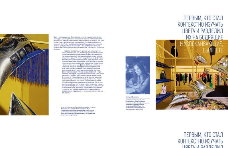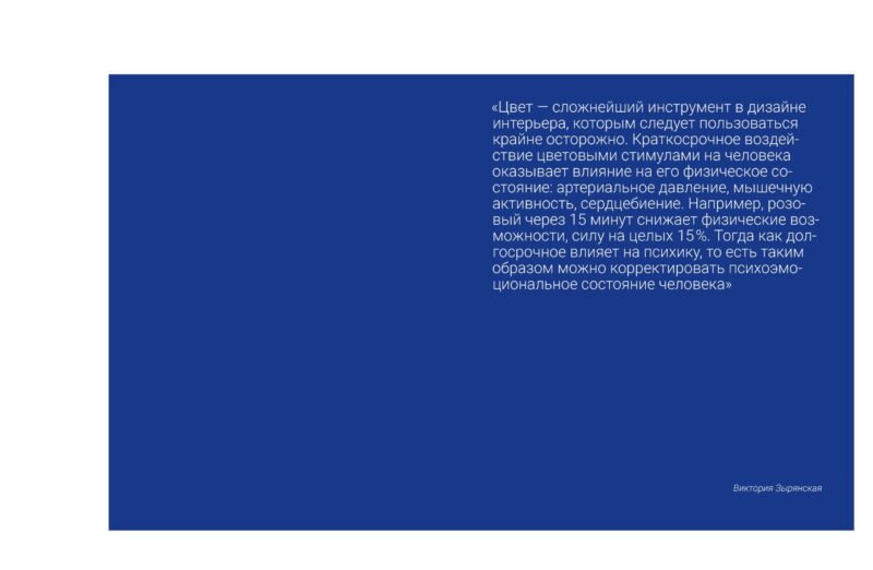 «Цвет — сложнейший инструмент в дизайне интерьера, которым следует пользоваться крайне осторожно. Краткосрочное воздействие цветовыми стимулами на человека оказывает влияние на его физическое состояние: артериальное давление, мышечную активность, сердцебиение. Например, розовый через 15 минут снижает физические возможности, силу на целых 15%. Тогда как долгосрочное влияет на психику, то есть таким образом можно корректировать психоэмоциональное состояние человека», – поделилась Виктория Зырянская.