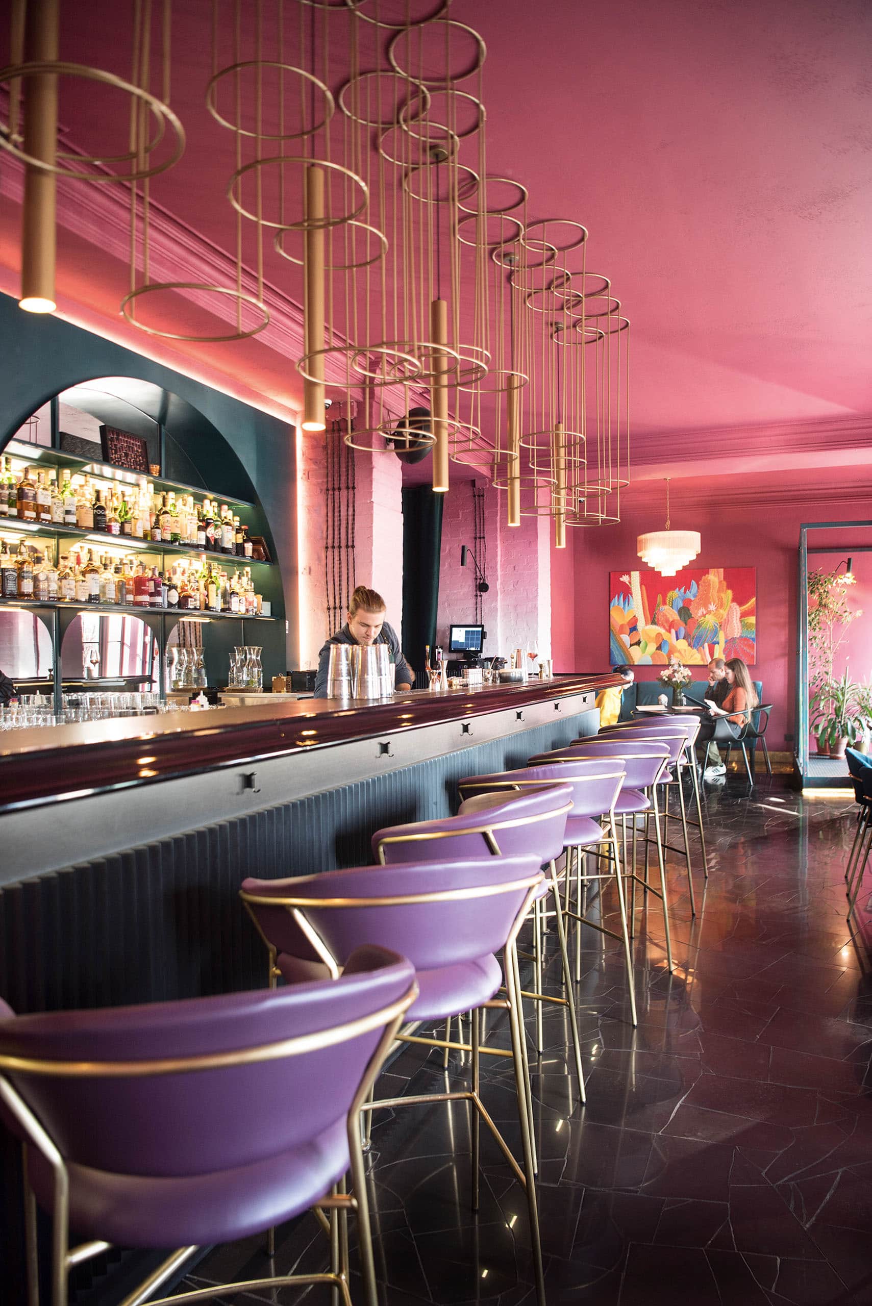 Chin Chin Bar в Запорожье. Авторы проекта — одесситы из JK Lab Architects: Александра Буровицкая, Виктория Лаврова и Жанна Киселева. Основной оттенок — игривый Cranberry Cocktail из палитры Benjamin Moore. Смелый ягодный оттенок располагает ко свободному общению, а градиент на стенах создает ощущение многослойности коктейля. Фото: Наталья Нагорная