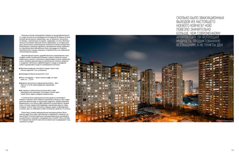 А скільки було евакуаційних виходів зі справжнього Ноєвого ковчега? Ноєві пощастило значно більше, ніж сучасному архітектору: він утілював мудрість, продиктовану Всевишнім, а не пункти ДБН, результат колективної творчості, а точніше — труднощів перекладу нормативів інших країн, що, до речі, теж написані людьми, навіть не деміургами, а отже, на жаль, не уникли положень, далеких від істини.