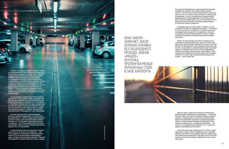 Чи може архітектура вплинути на швидкість виникнення та поширення паніки? У якому просторі люди менше схильні до паніки, а в якому — більше? У просторі, де очевидна навігація, де зрозуміло, «куди бігти», архітектура якого видається надійною, в якому багато світла, люди схильні до паніки значно менше, ніж в утилітарно, погано освітленому лабіринті тунелів, навіть якщо в першому випадку є тільки один евакуаційний вихід, а в другому — два чи навіть три!
