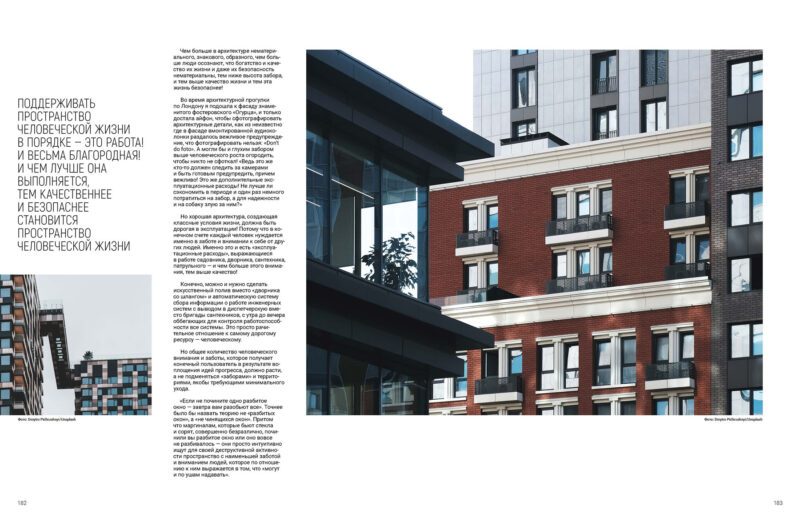 Але хороша архітектура, яка створює класні умови життя, має бути дорогою в експлуатації! Тому що зрештою кожна людина потребує саме турботи та уваги до себе від інших людей. Саме це і є «експлуатаційні витрати», що виражаються в роботі садівника, двірника, сантехніка, патрульного — і чим більше цієї уваги, тим вища якість!
