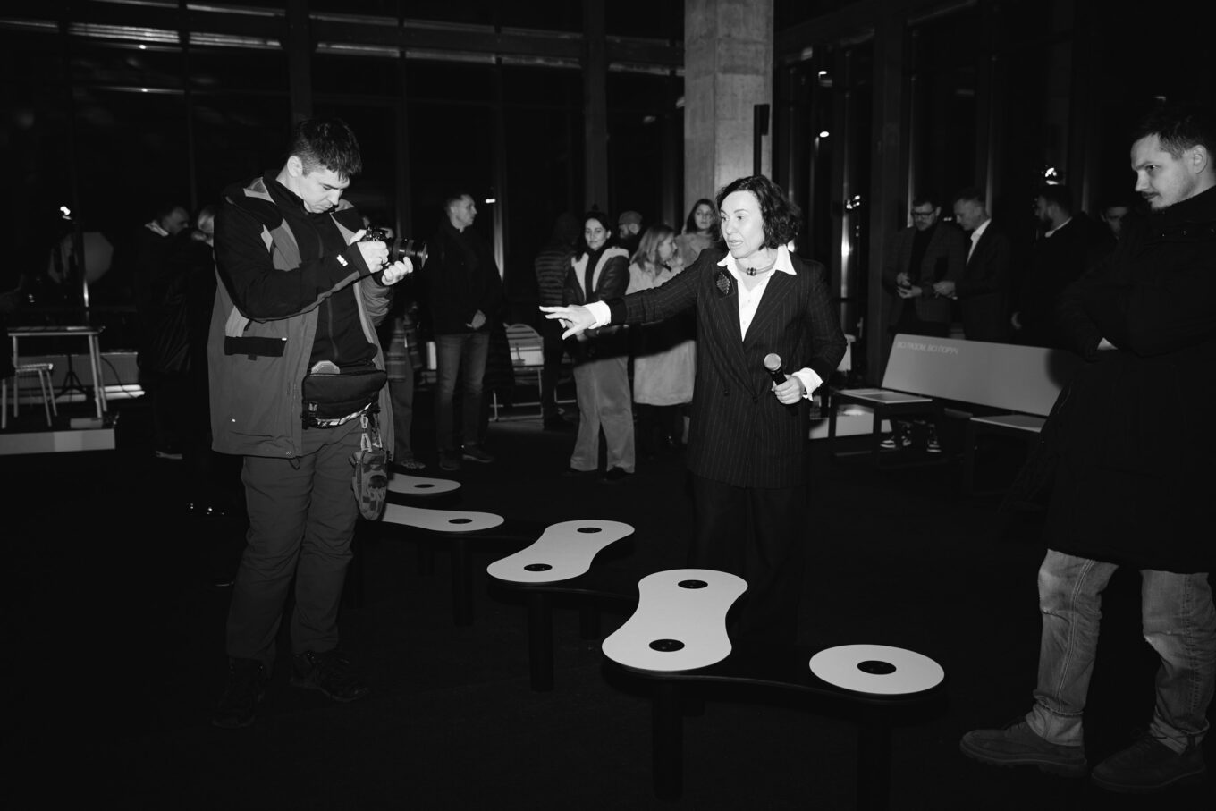 Панорама центру нічного Києва за вікнами підкреслювала урбаністичну естетику об’єктів експозиції, над концептуальною сценографією якої працював промисловий дизайнер Євген Пукліч. Спеціальні виставкові стенди для експозиції розробила меблева майстерня Kassone.