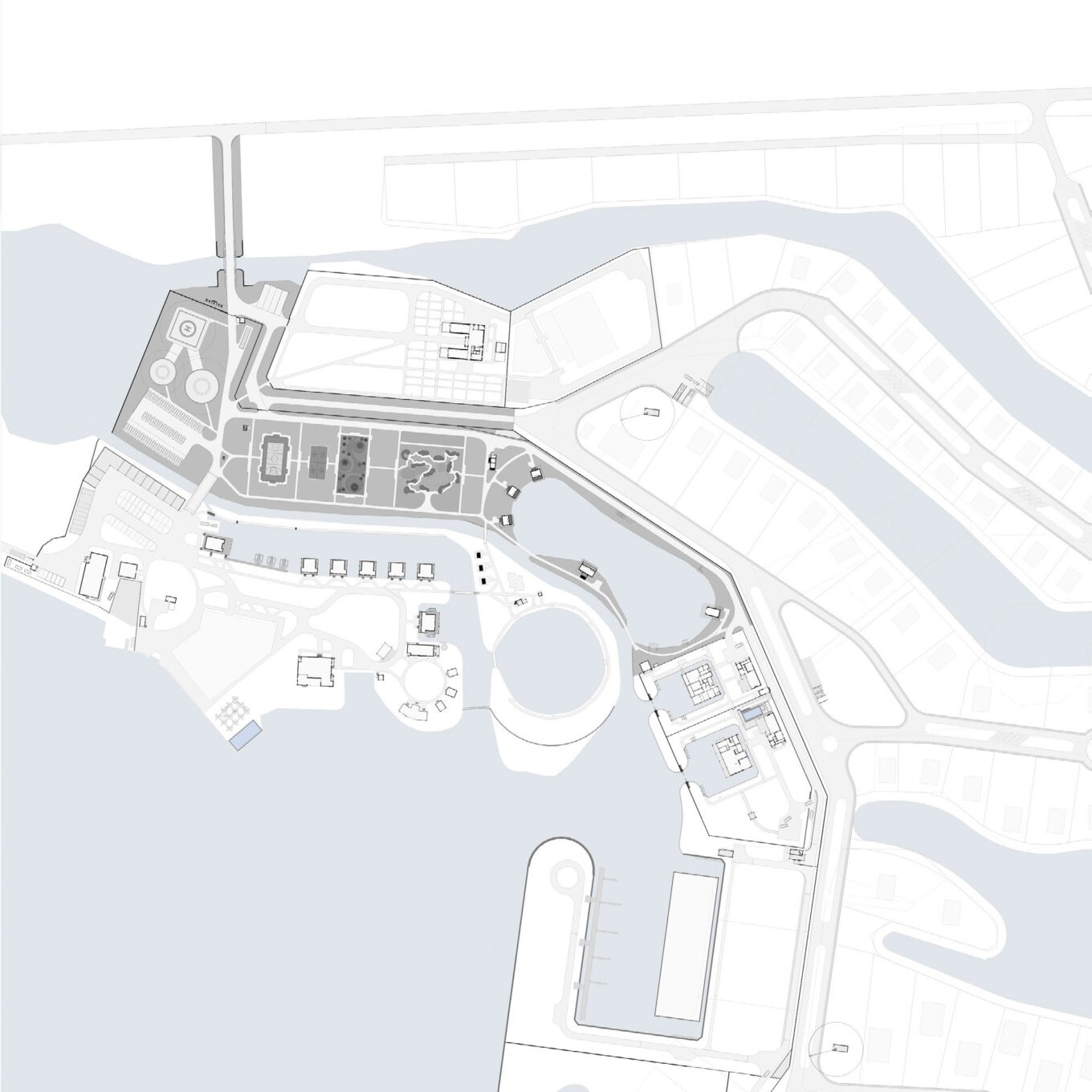 Перша черга будівництва була підпорядкована ідеї створення чоловічого клубу. Вздовж берегової лінії побудували адмінбудівлю та магазин із рибальським екіпіруванням, на понтоні — човнову станцію з причалами, елінги для човнів, тир, дім-баню з виходом до води на понтоні, пляж із басейном на понтоні, гриль-бар, VIP-котедж та п’ять плавучих будинків, пришвартованих уздовж каналу прямо на воді, а також створили озеро з осетровими.