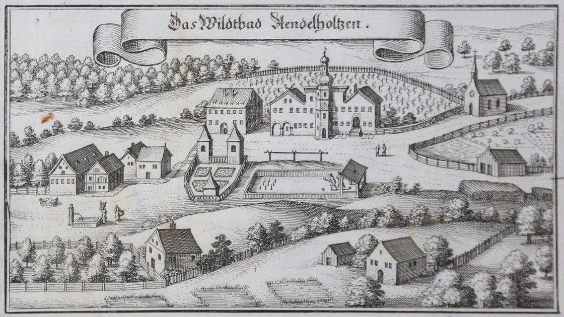 Гравюра Маттеуса Меріана, що входить до зібрання Topographia Bavariae із зображенням курорту Wildbad Adelholzen. Джерело зображення: Wikipedia