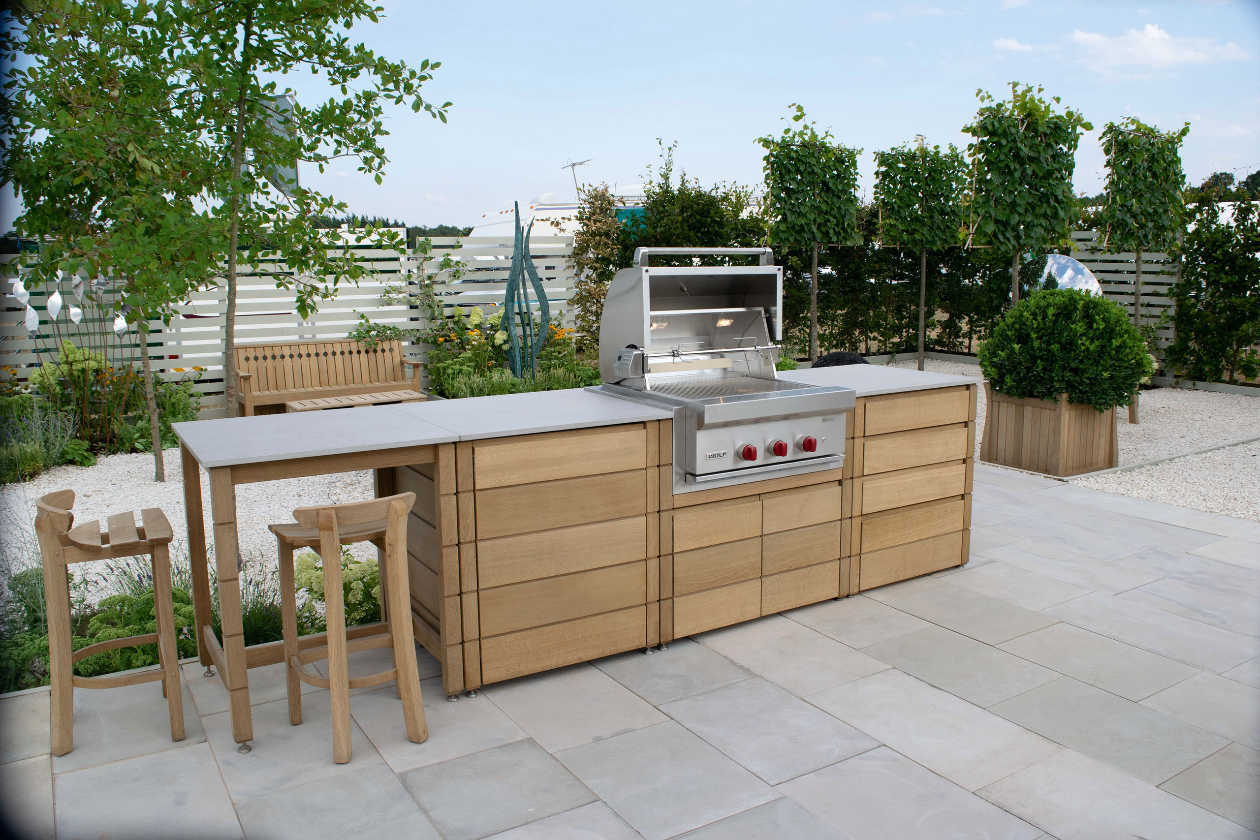 Садовая кухня с грилем и барной стойкой от британского производителя Gaze Burvill. Материалы — древесина дуба, композитный материал Dekton (столешница) и нержавеющая сталь — устойчивы к атмосферным воздействиям. Источник изображения: gazeburvill.com
