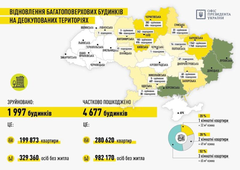 Розпорядником бюджетних коштів на відновлювальні роботи, зокрема й на будівництво нового житла, призначено Міністерство розвитку громад, територій та інфраструктури. Пропозиції вносять військові адміністрації. У квітні 2023 року Кабмін схвалив Стратегію державної політики щодо внутрішнього переміщення на період до 2025 року. Також затверджений відповідний операційний план на 2023–2025 роки. Стратегія розроблена Мінреінтеграції за підтримки Ради Європи. До напрацювання документа також долучилися експерти громадських і міжнародних організацій, які опікуються захистом прав внутрішньо переміщених осіб.